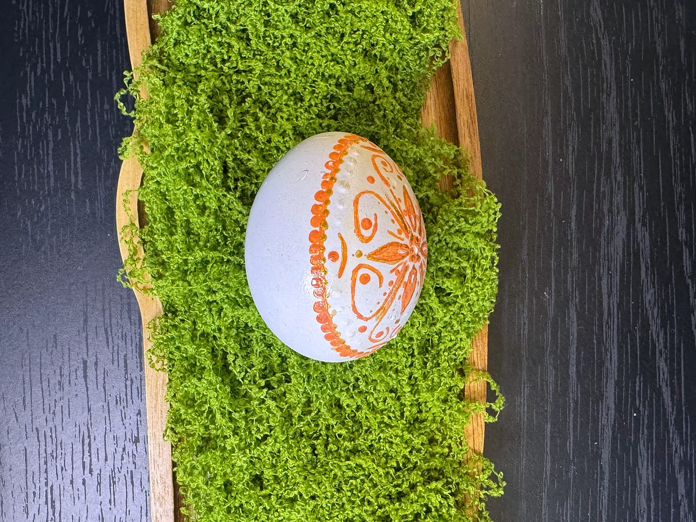 Ručno crtan dizajn u toploj bakreno-smeđoj boji na prirodnoj bijeloj ljusci. Veliki simetrični cvjetni motiv razvija se iz središta, sa slojevitim laticama i kapljičastim oblicima koji se šire prema van.