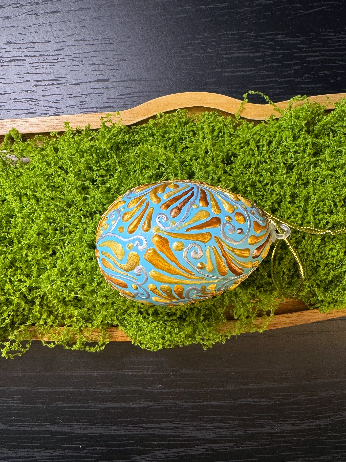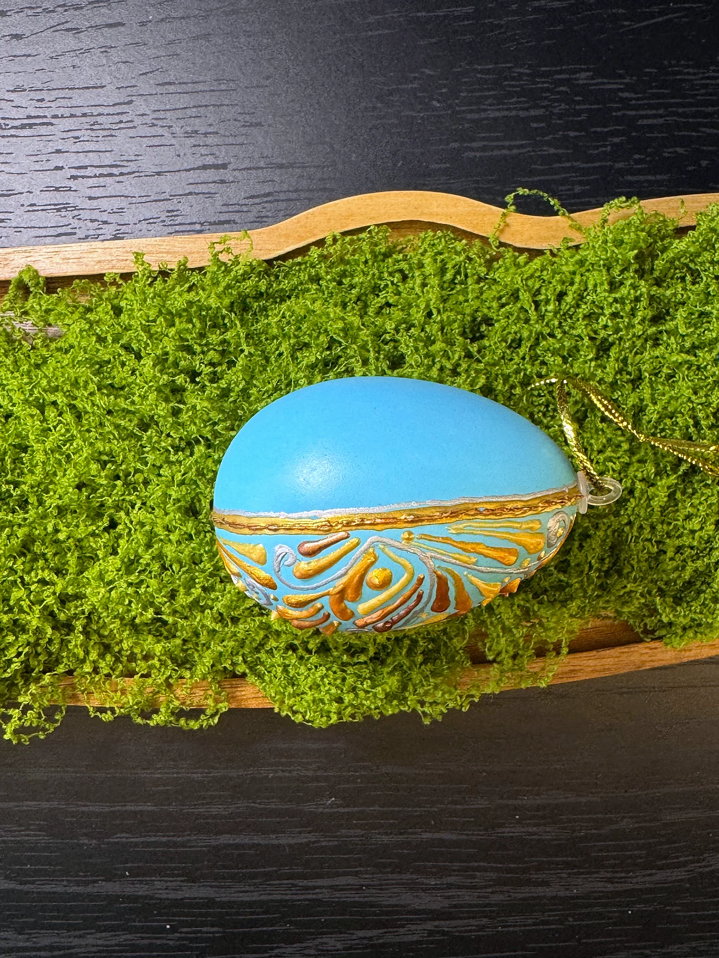Blijedoplavo jaje prekriveno vijugavim zlatno-jantarnim i nježno plavim arabeskama, evocirajući bizantsku ili osmansku dekorativnu tradiciju. Preplitanje tople zlatne i hladne plave blistavo je i luminozno.