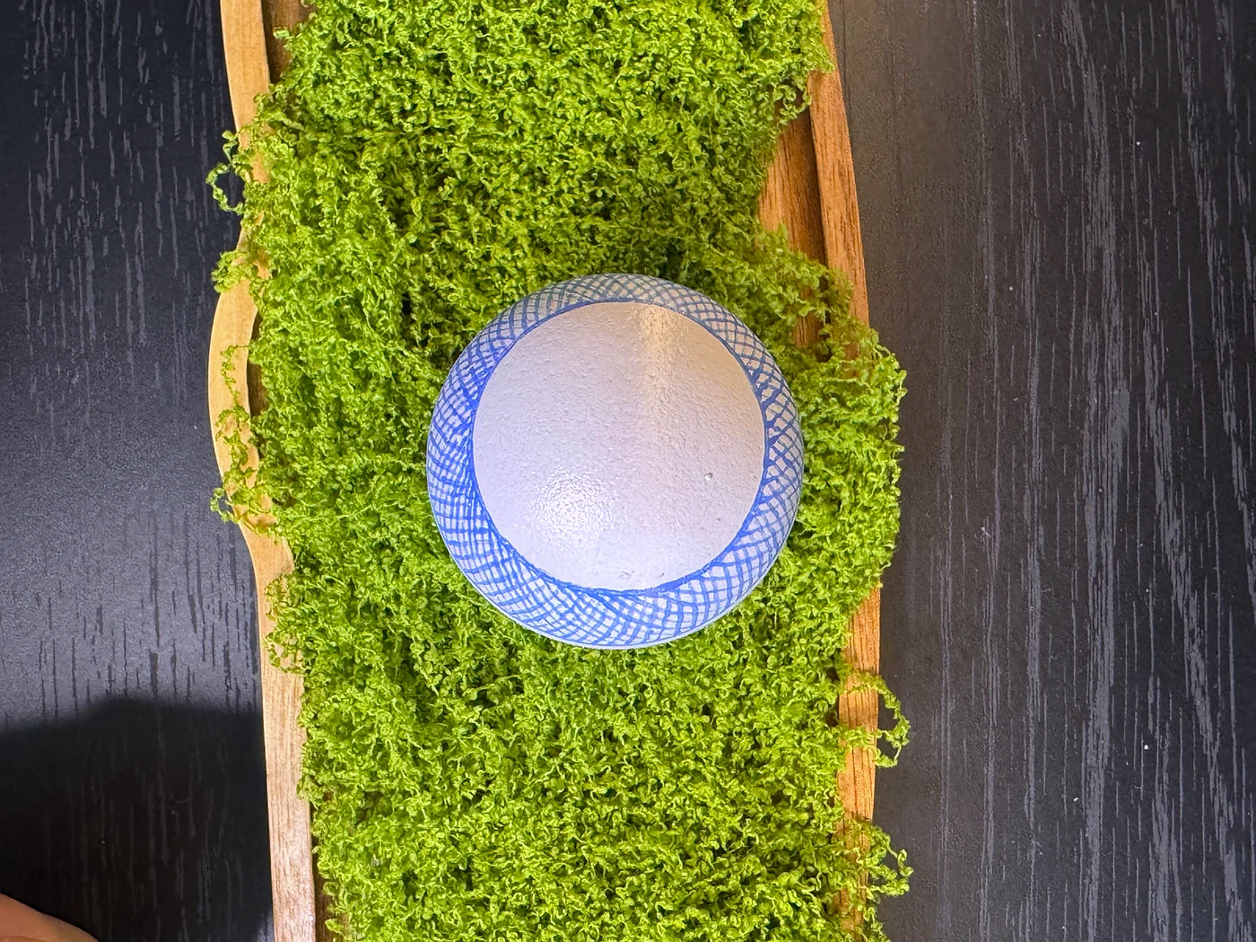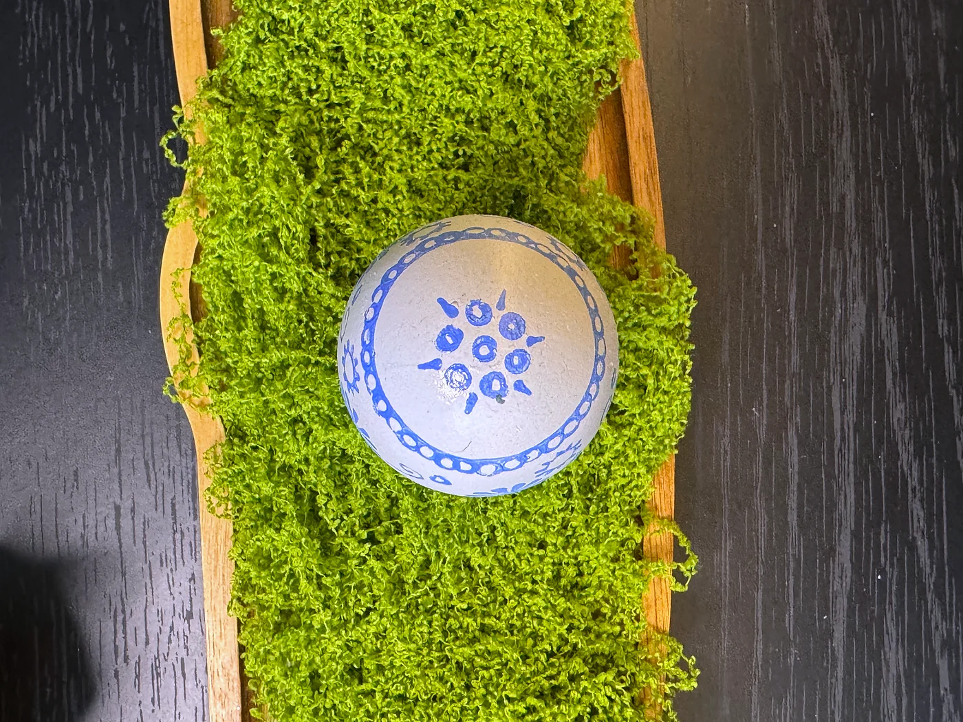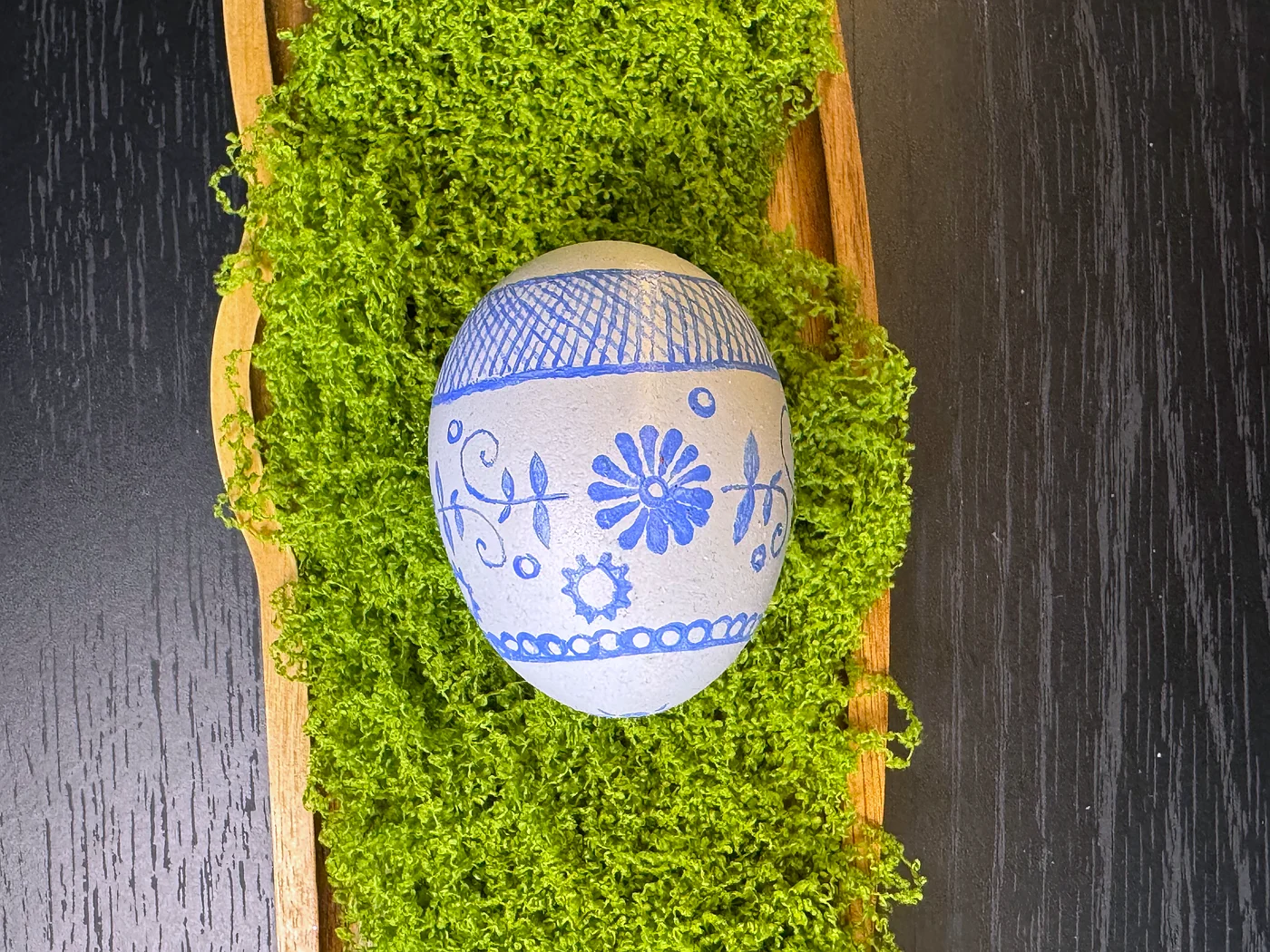 Ručno oslikan plavo-bijeli dizajn inspiriran delftskom keramikom. Cvjetni motivi uključujući veliku margaretu i ukrižano lišće izvedeni su u kobaltno plavoj na čistoj bijeloj podlozi.