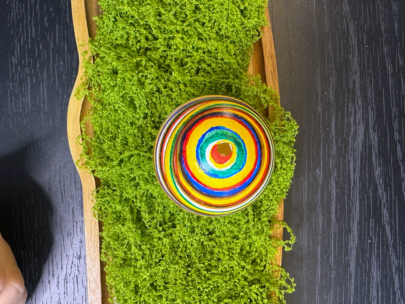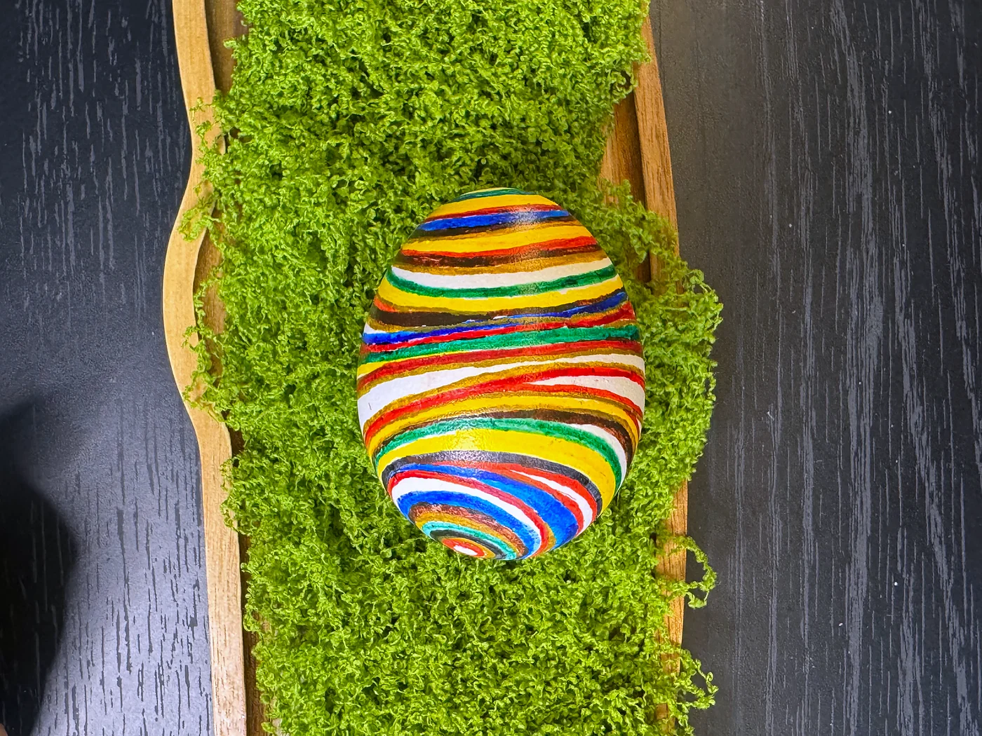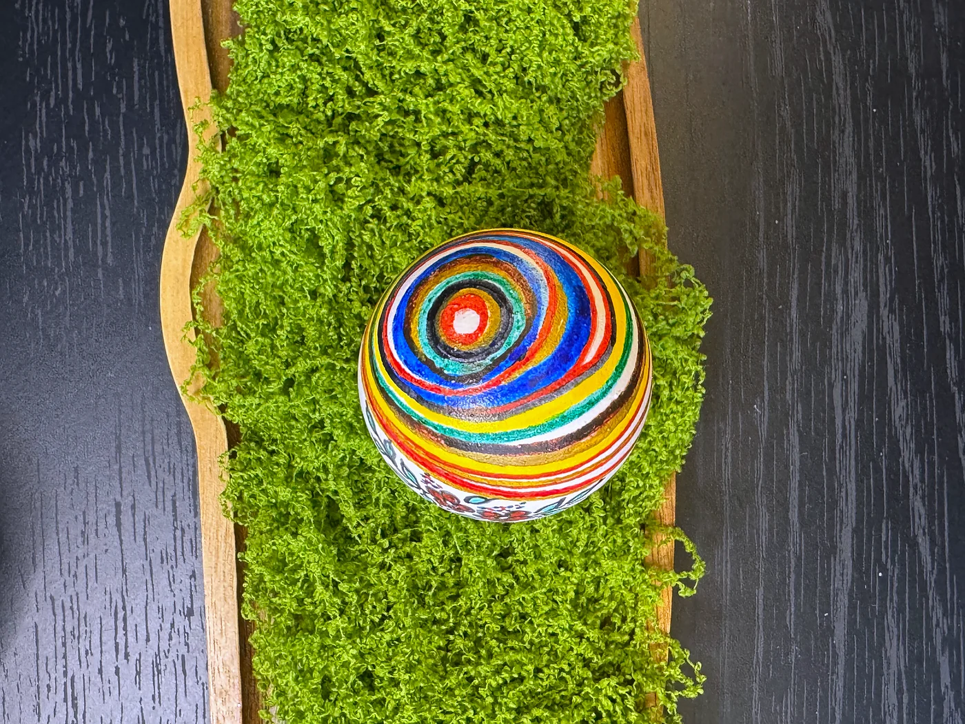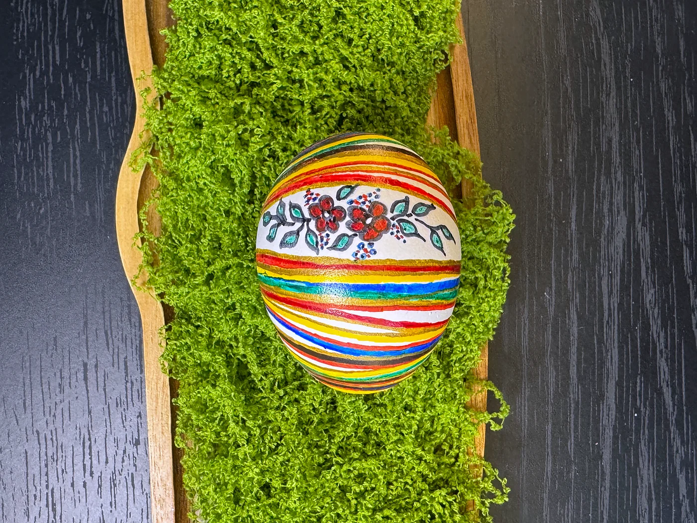 Ručno oslikani cvjetni dizajn na višebojnoj prugastoj pozadini. Tanke vodoravne trake u zelenoj, žutoj, narančastoj, crvenoj i plavoj boji obavijaju jaje, prekrivene buketom ruža i lišća u folklornom stilu.