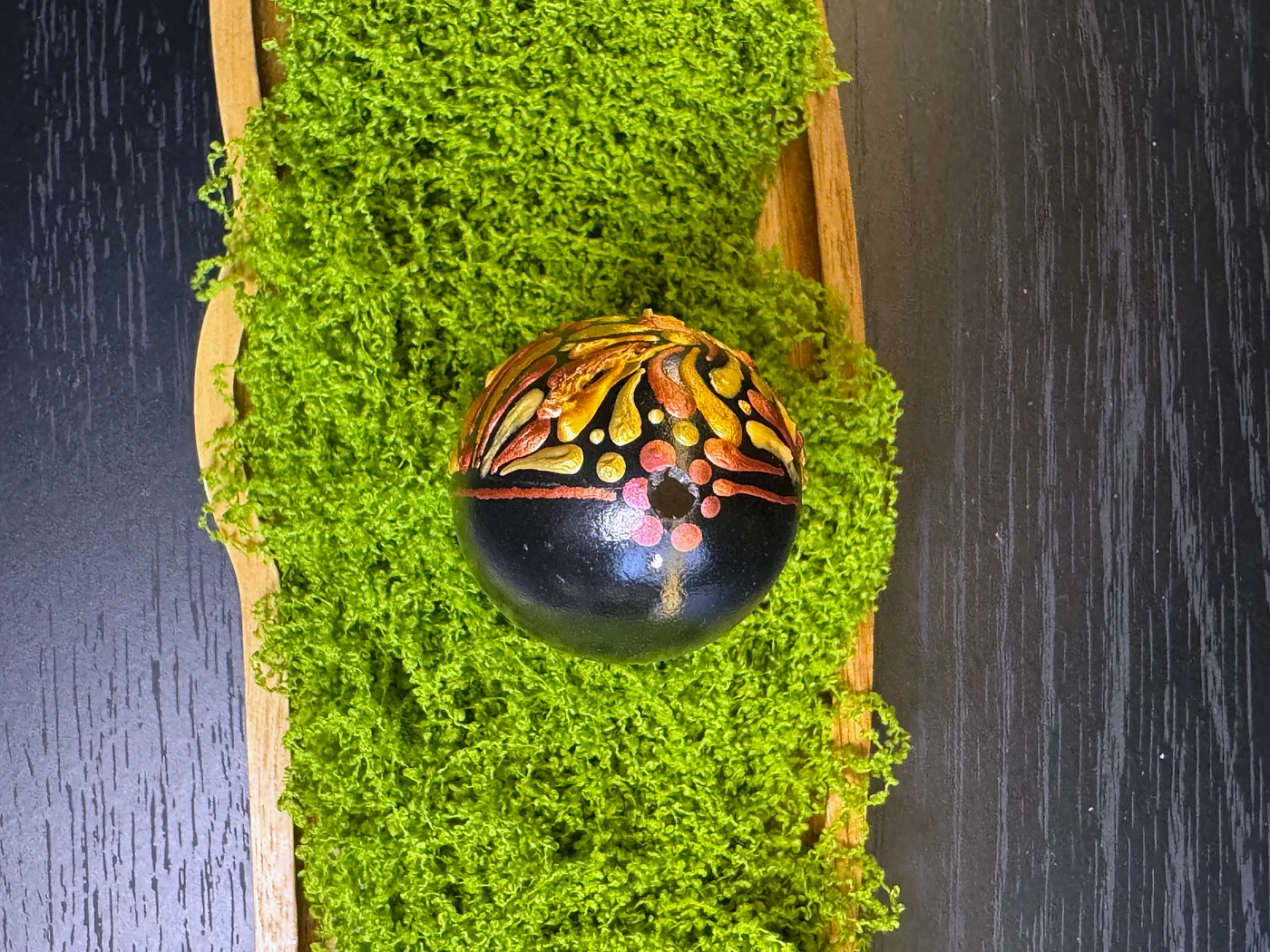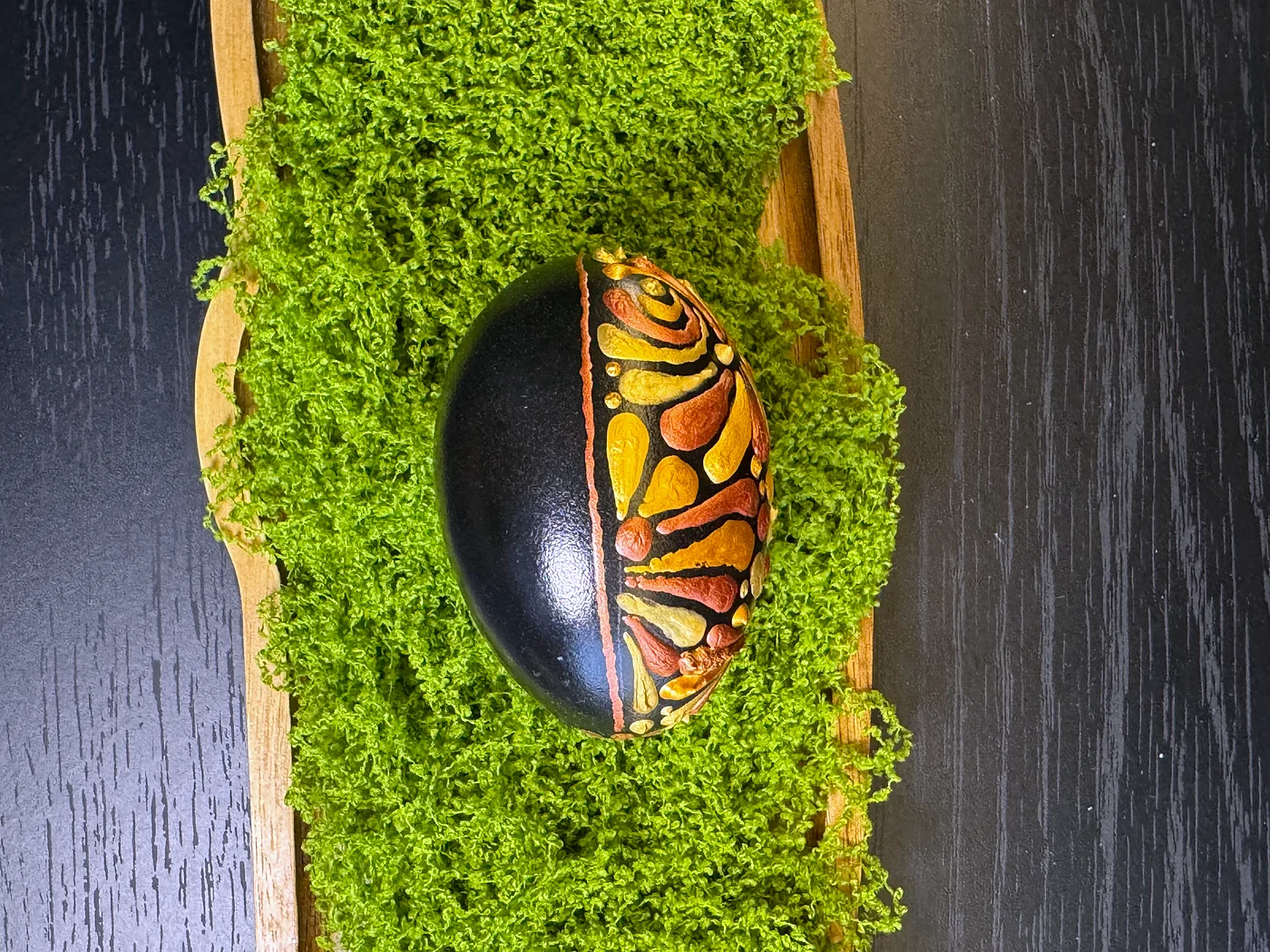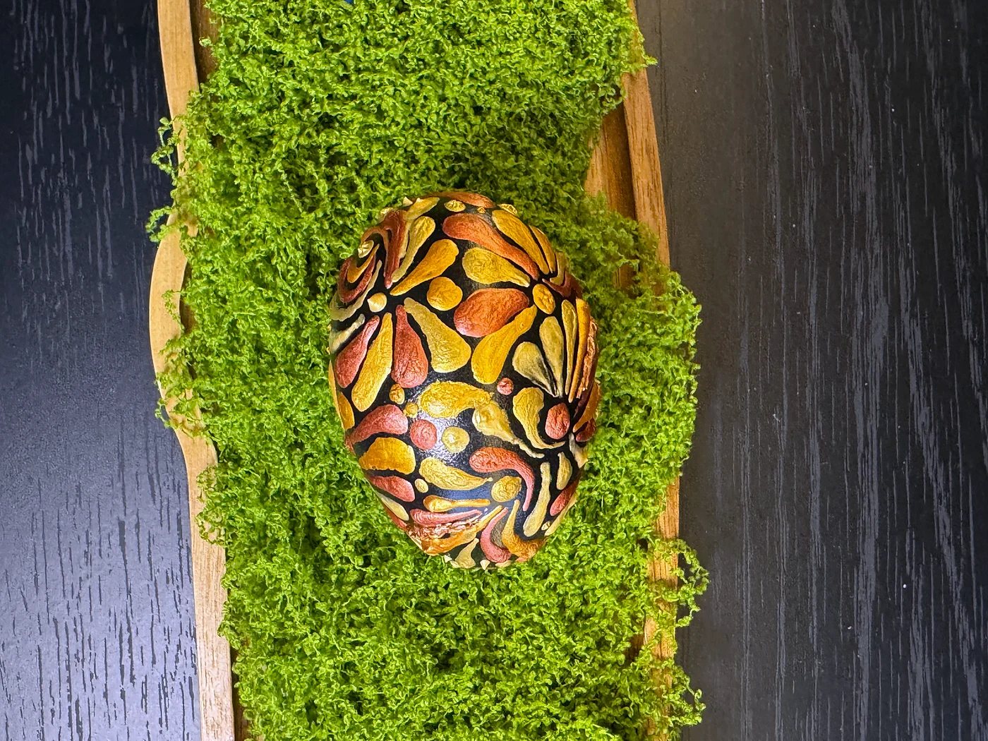 Bogato zasićeno jaje gusto prekriveno preklapajućim cvjetnim i lisnim oblicima u vatrenim nijansama jantara, spaljene narančaste i zlata na tamnoj podlozi. Efekt nalik goblenu.