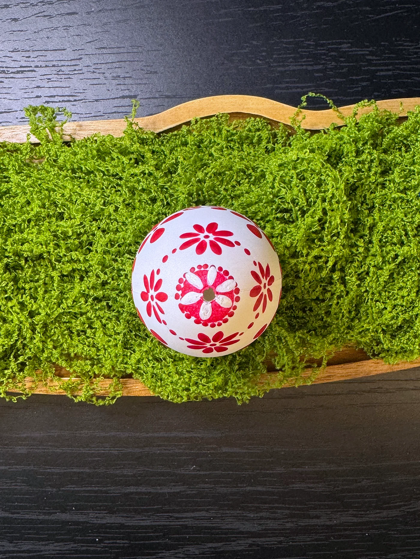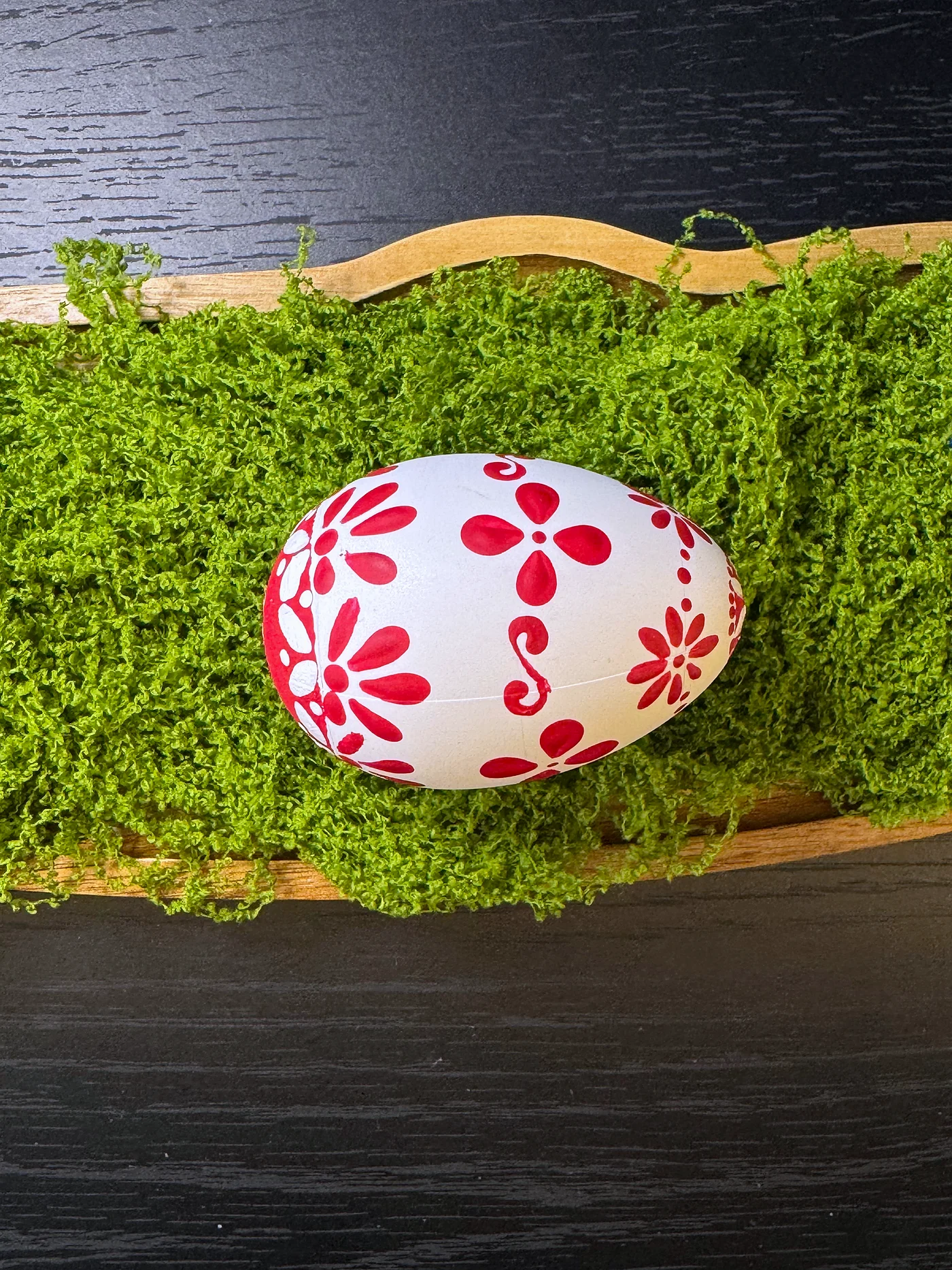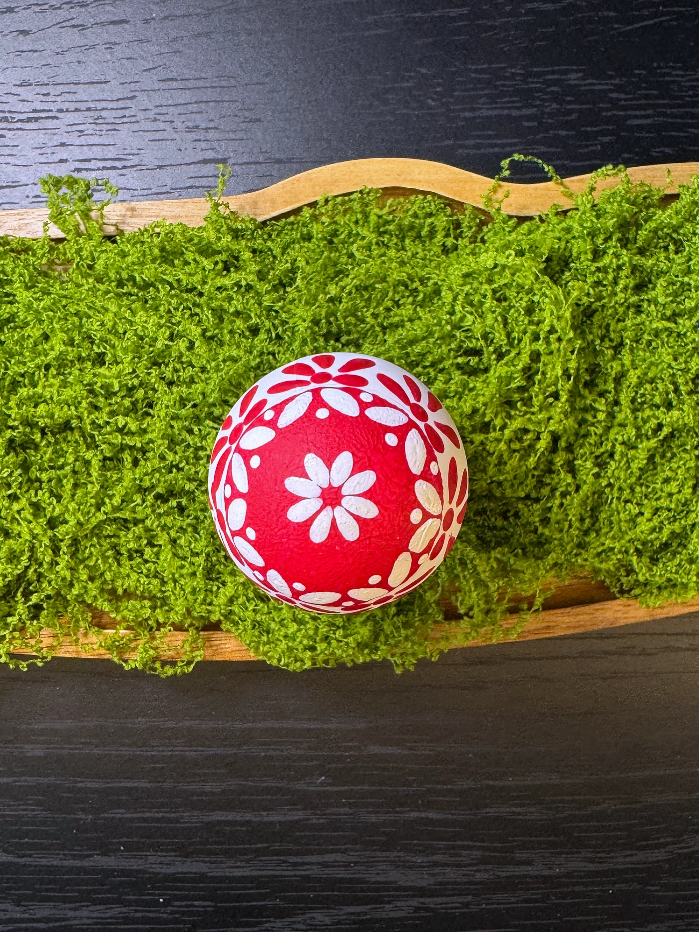 Čisto bijelo jaje ukrašeno smjelim crvenim folklornim motivima. Stilizirani vjetrenjačasti cvjetovi, zvjezdaste tratinčice i uvijene vitice loze u bogatoj grimiznoj daju upečatljivu grafičku jasnoću.