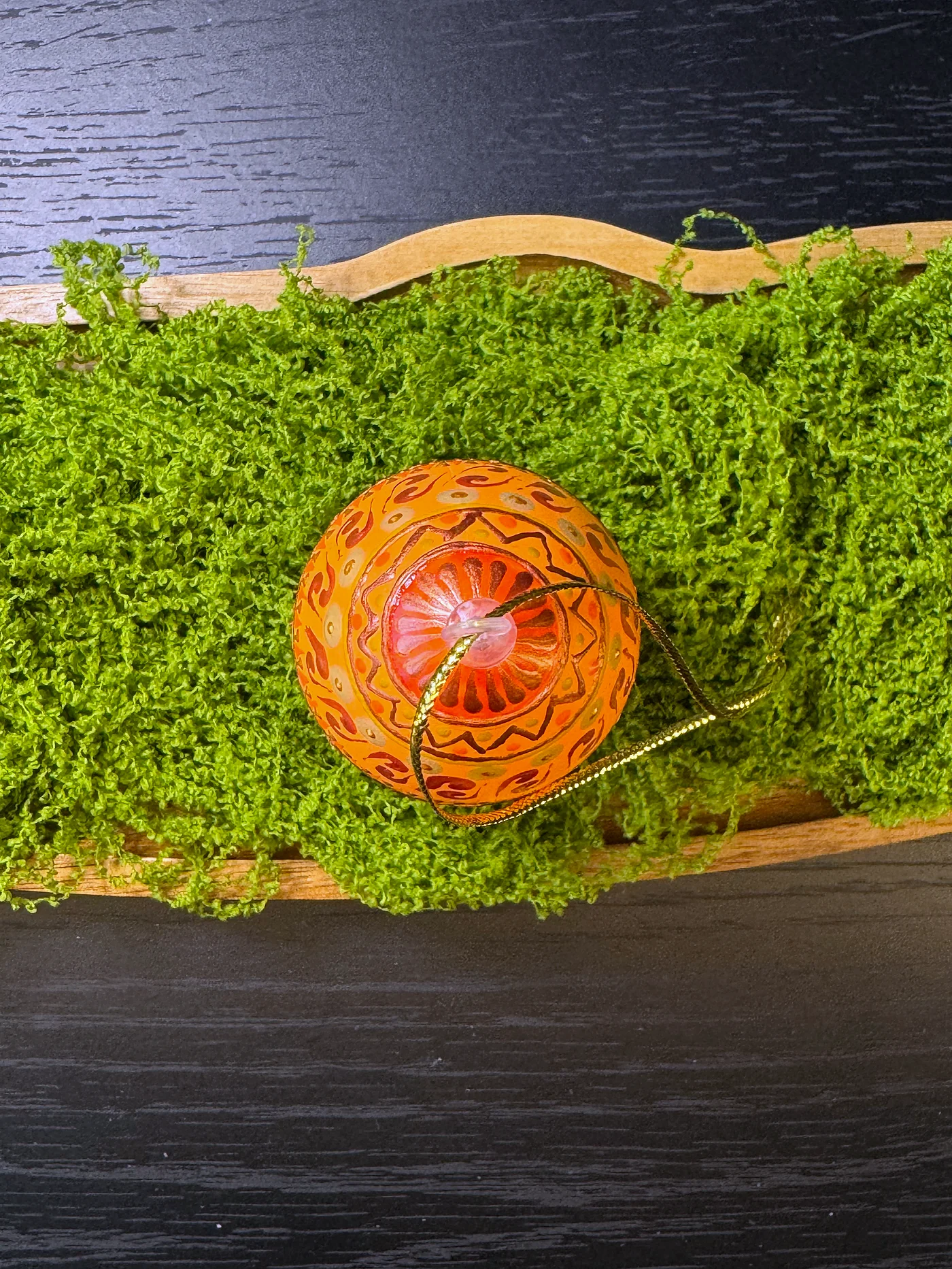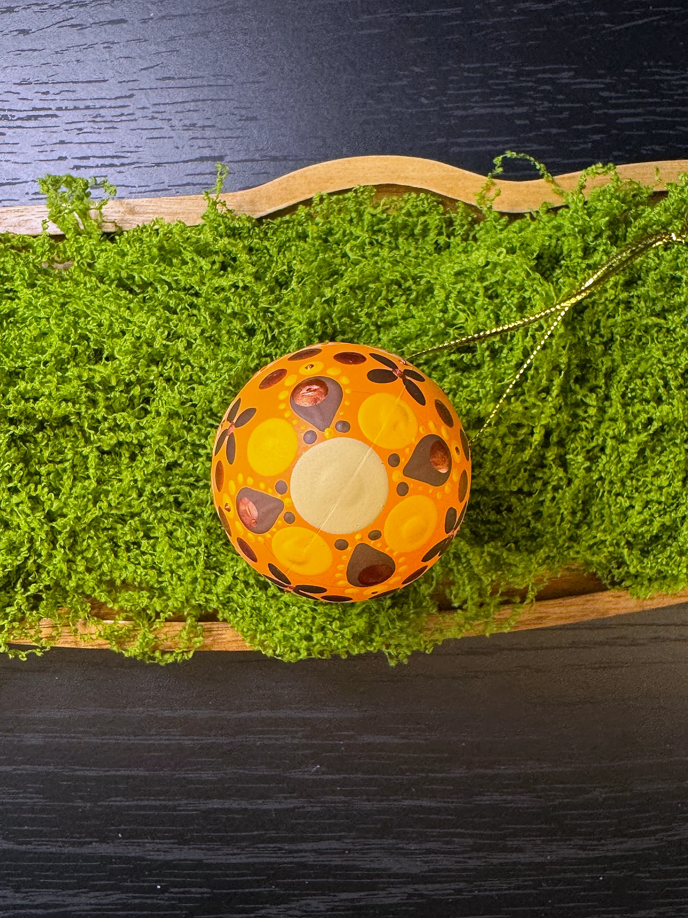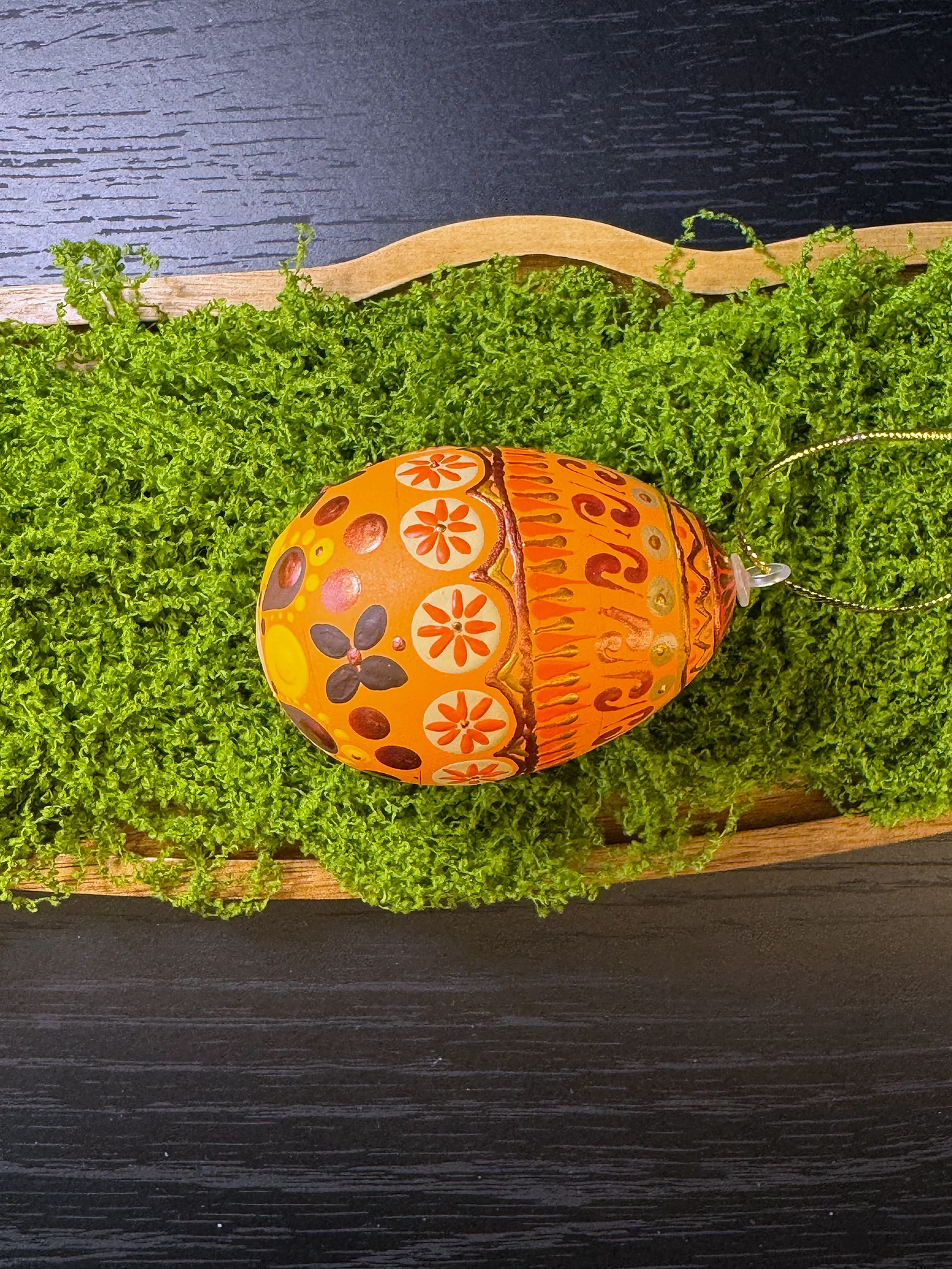 Toplo narančasto jaje gusto prekriveno ručno oslikanim cvjetnim i geometrijskim motivima u spaljenoj sijeni i tamnosmeđoj. Cvjetovi nalik tratinčicama i trake vitica stvaraju bogatu, zemljanu toplinu.