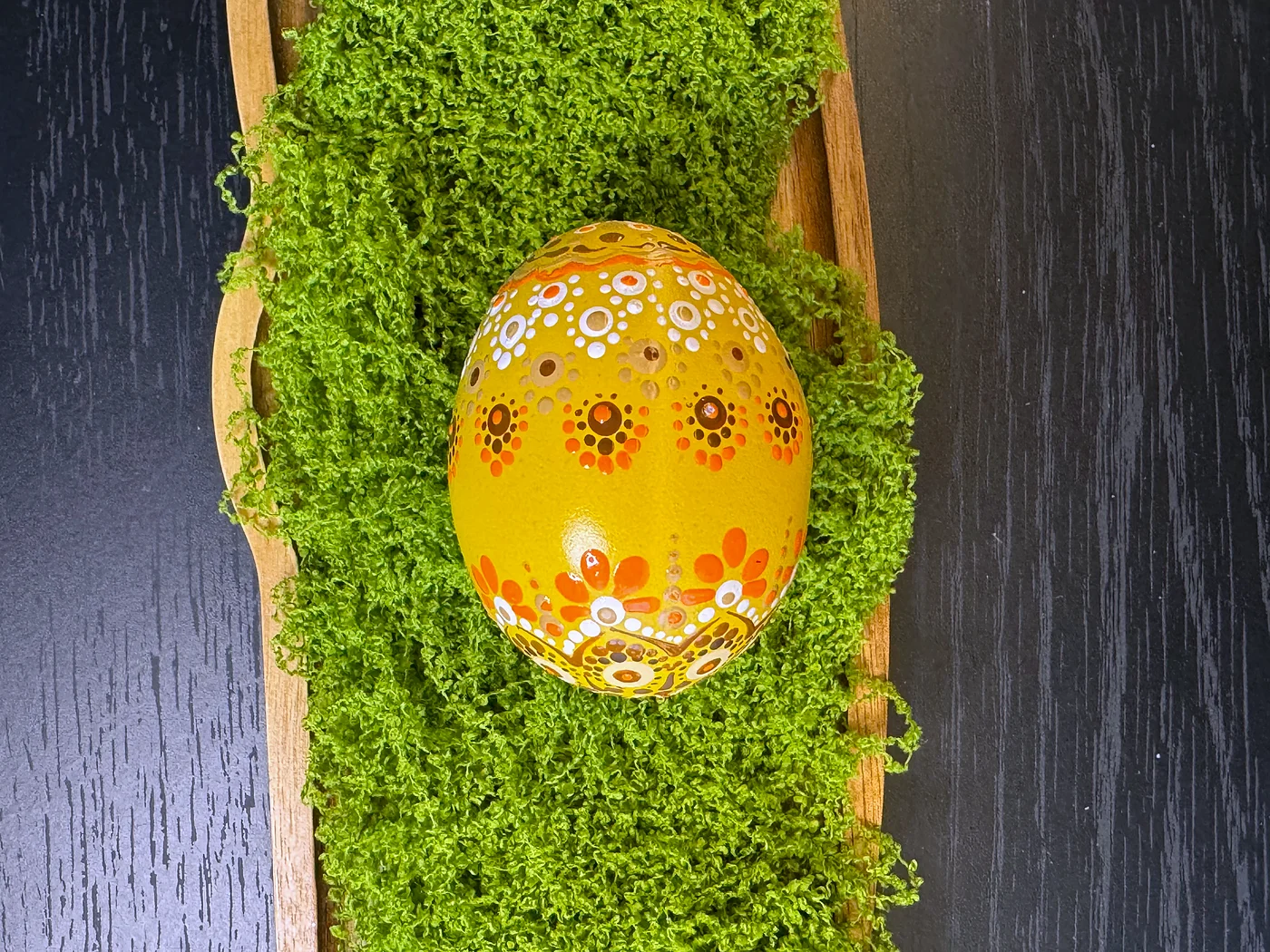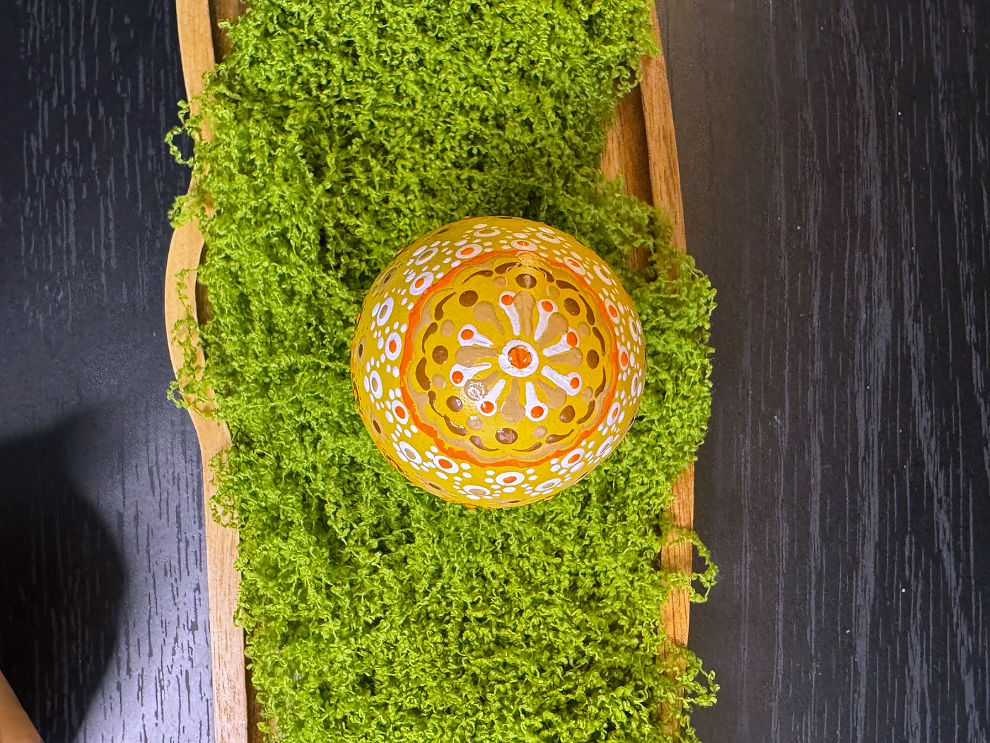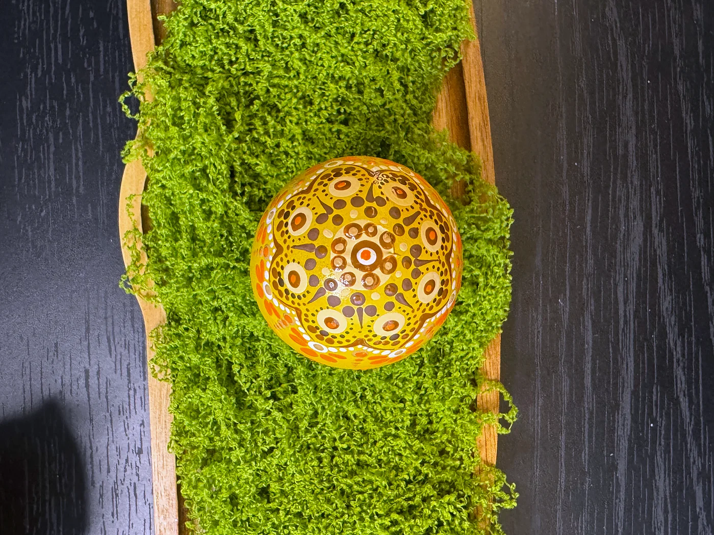 Ručno oslikani točkasti i cvjetni dizajn na toploj zlatno-narančastoj podlozi. Grozdovi malih cvjetova nalik tratinčicama s tamnim središtima okruženi su oreolima bijelih i narančastih točaka, stvarajući polje nadahnuto mandalom.
