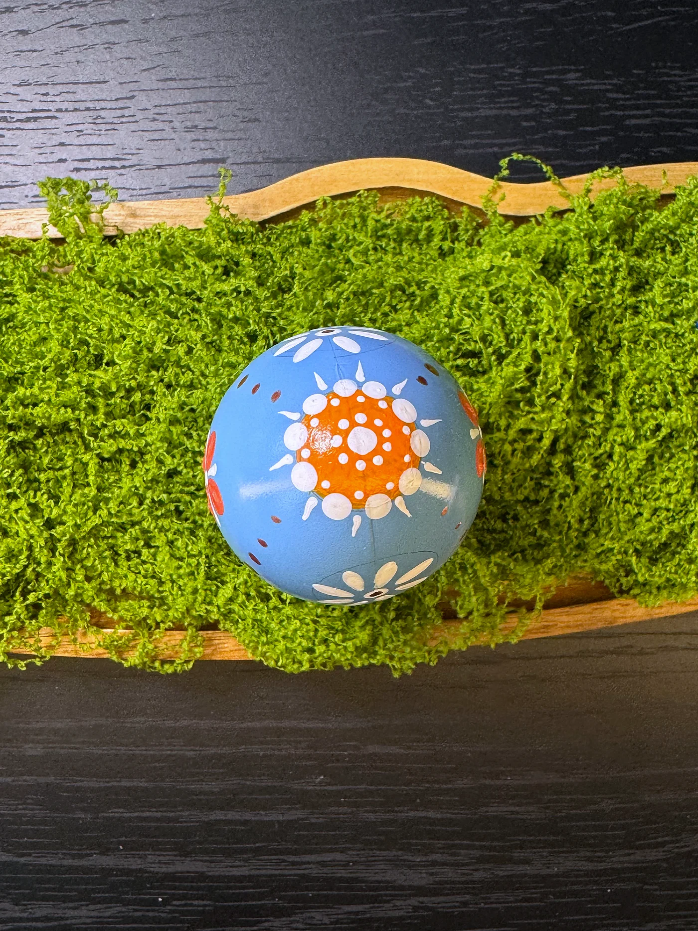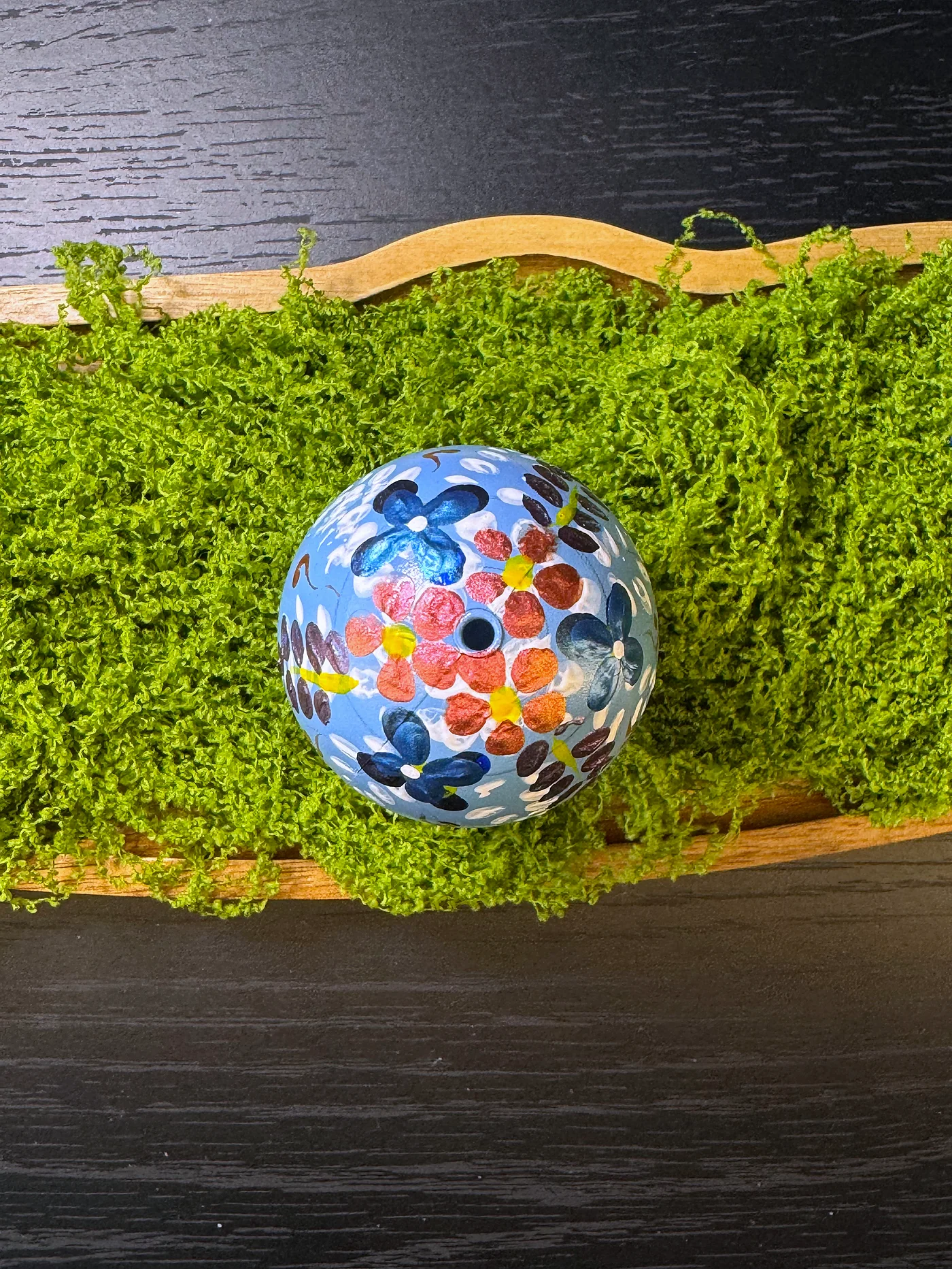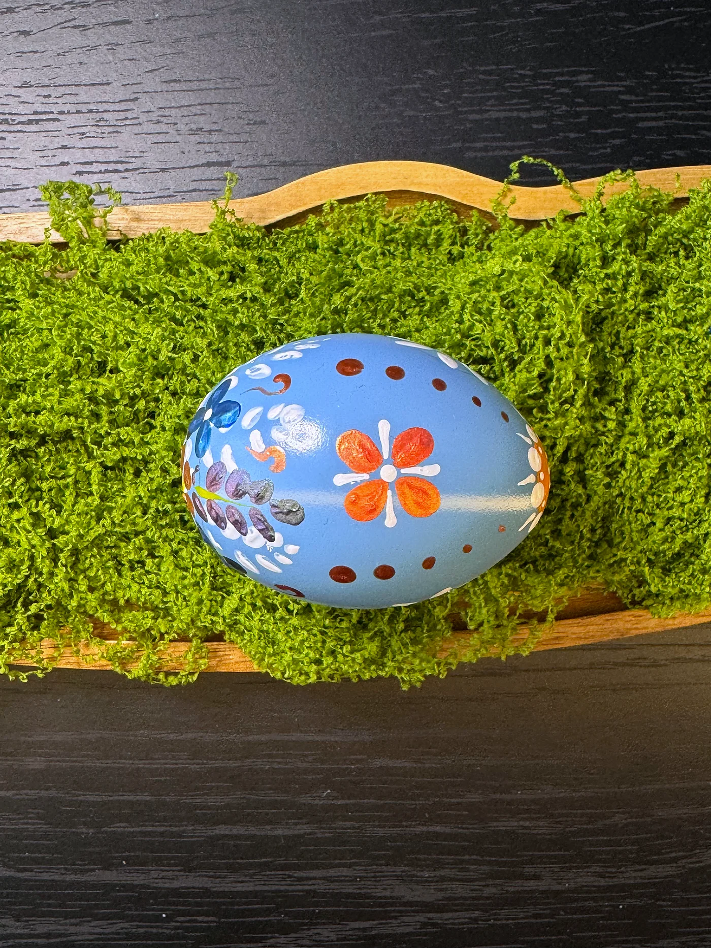 Nježno ljubičasto-plavo jaje ukrašeno veselim ručno oslikanim cvjetovima i grozdovima točaka. Narančasti četverolatični cvijet zauzima središnje mjesto, okružen manjim bijelim i ljubičastim cvjetovima.