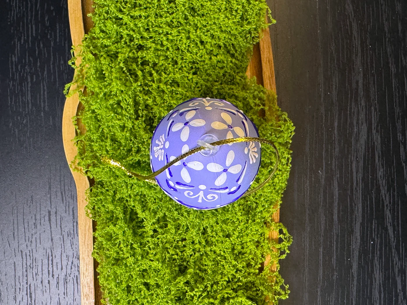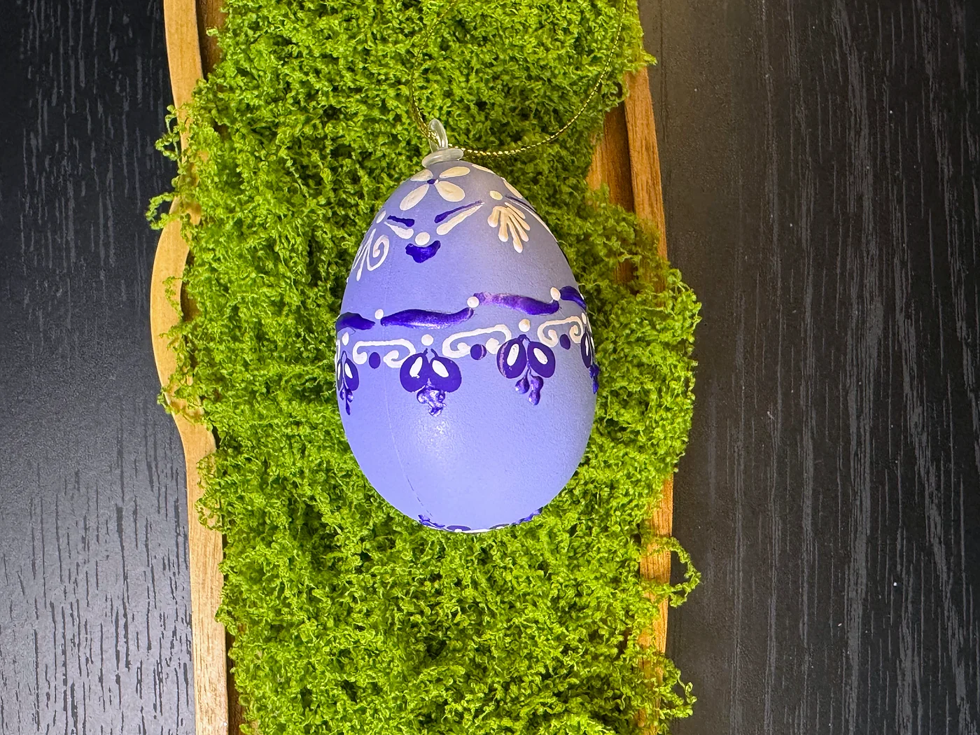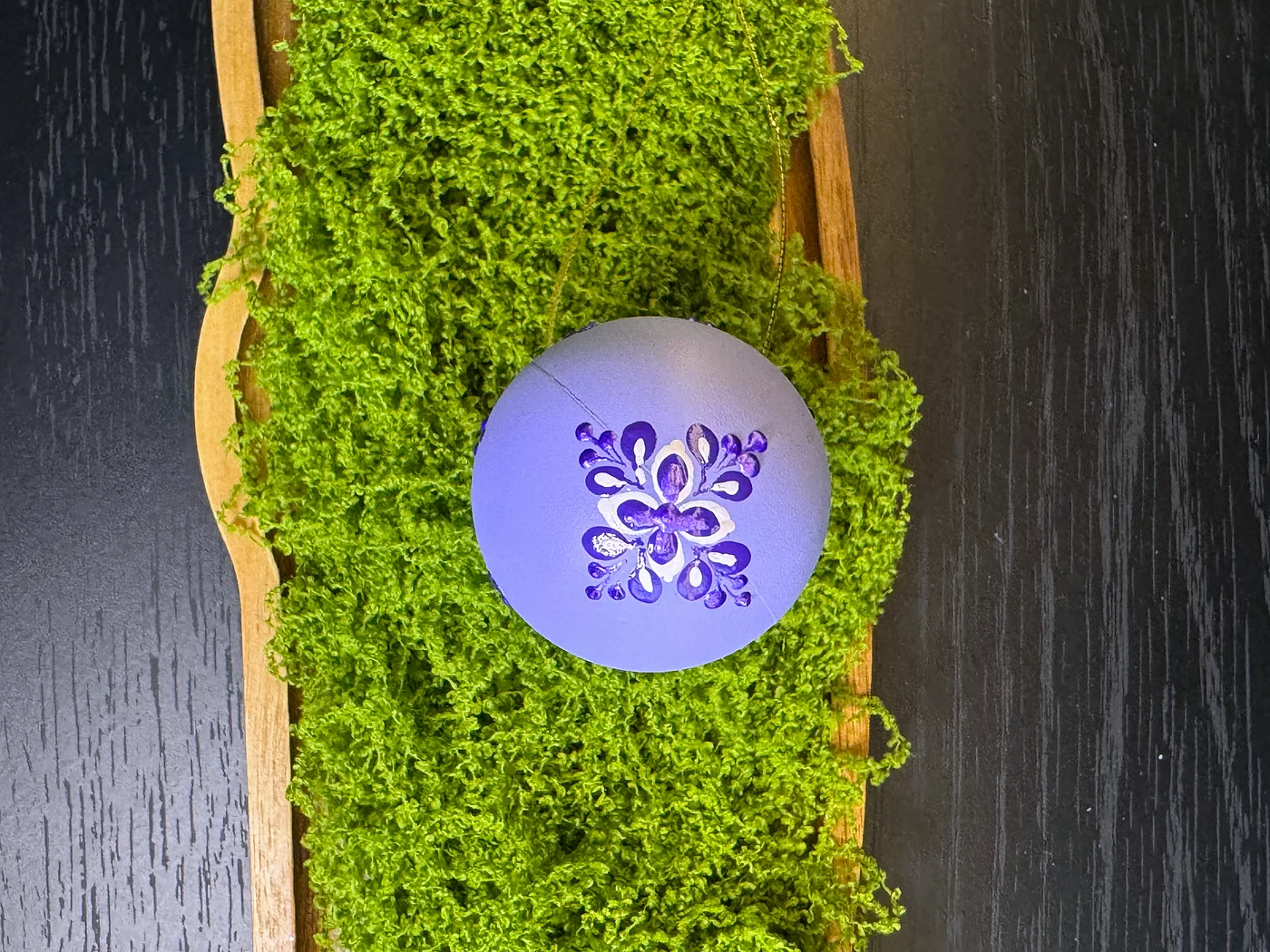 Nježno ljubičasto jaje opasano ručno oslikanom girlandom bijelih i tamnoljubičastih cvjetnih elemenata. Slojevita ljubičasto-na-ljubičastoj paleta stvara sanjivu, elegantnu atmosferu.