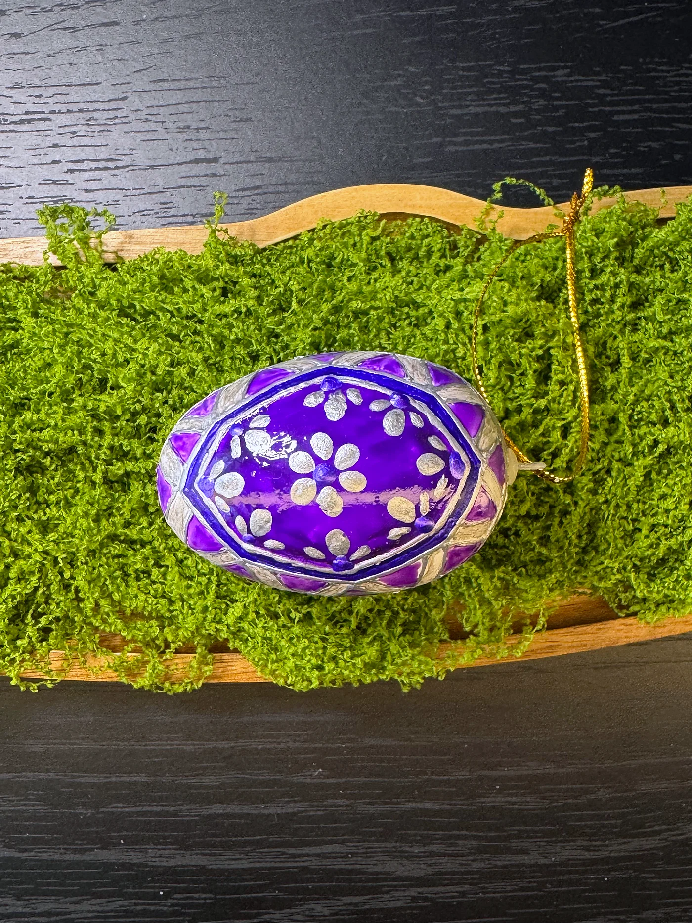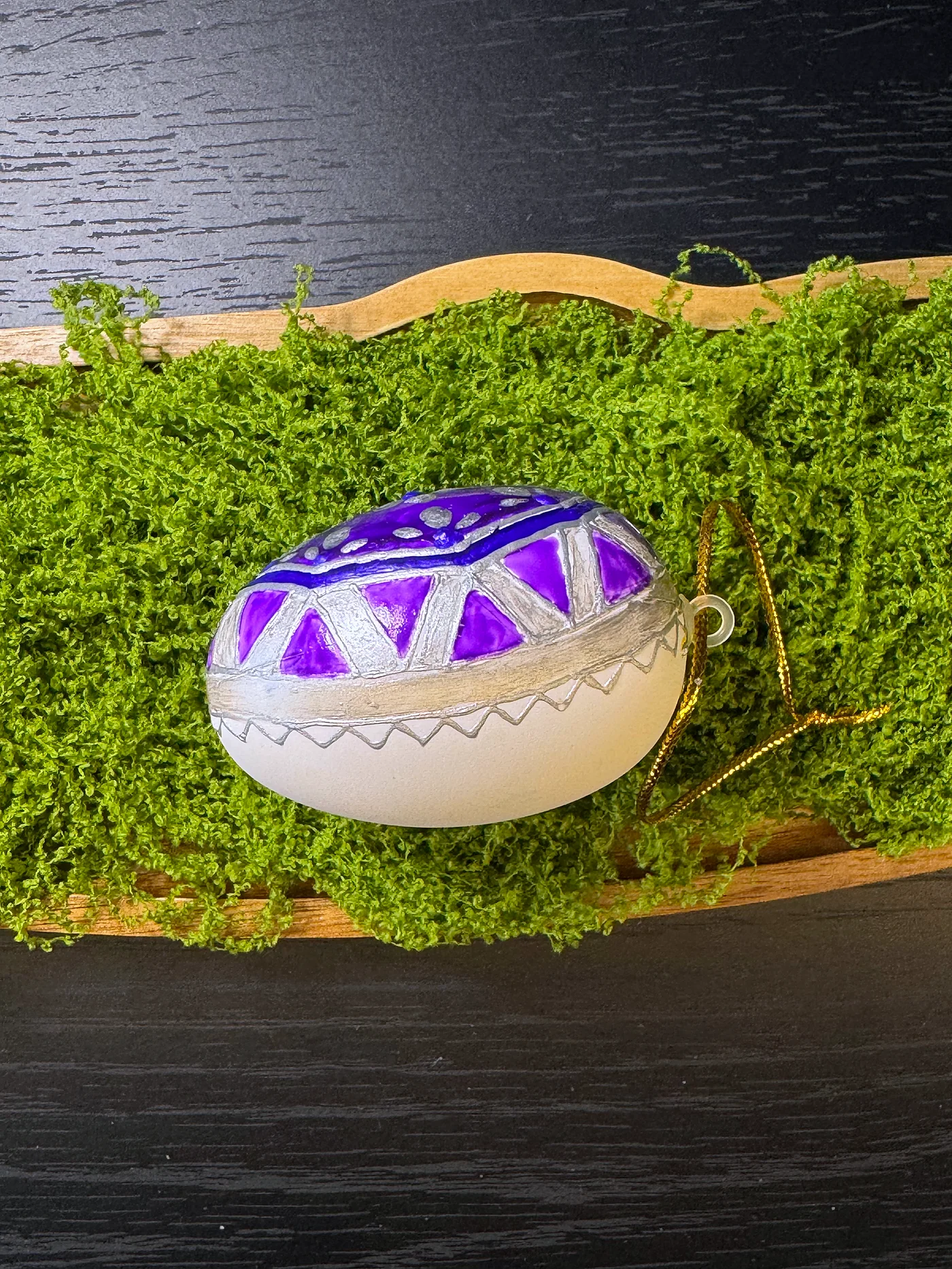 Duboko ljubičasto jaje ukrašeno nježnim bijelim cvjetnim grančicama i lisnim motivima. Geometrijski okviri u obliku dijamanta dijele površinu na sekcije.