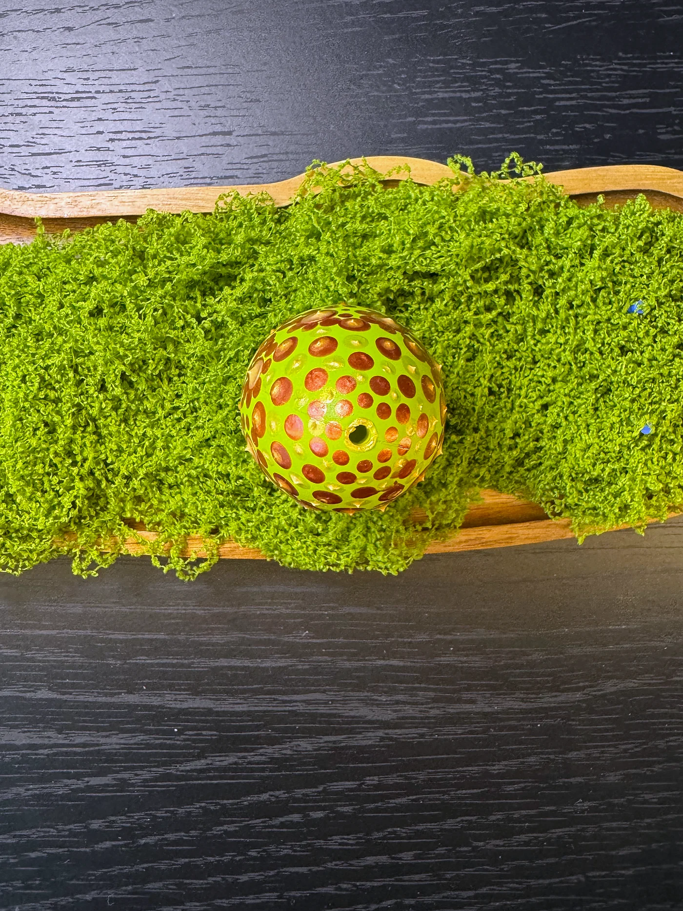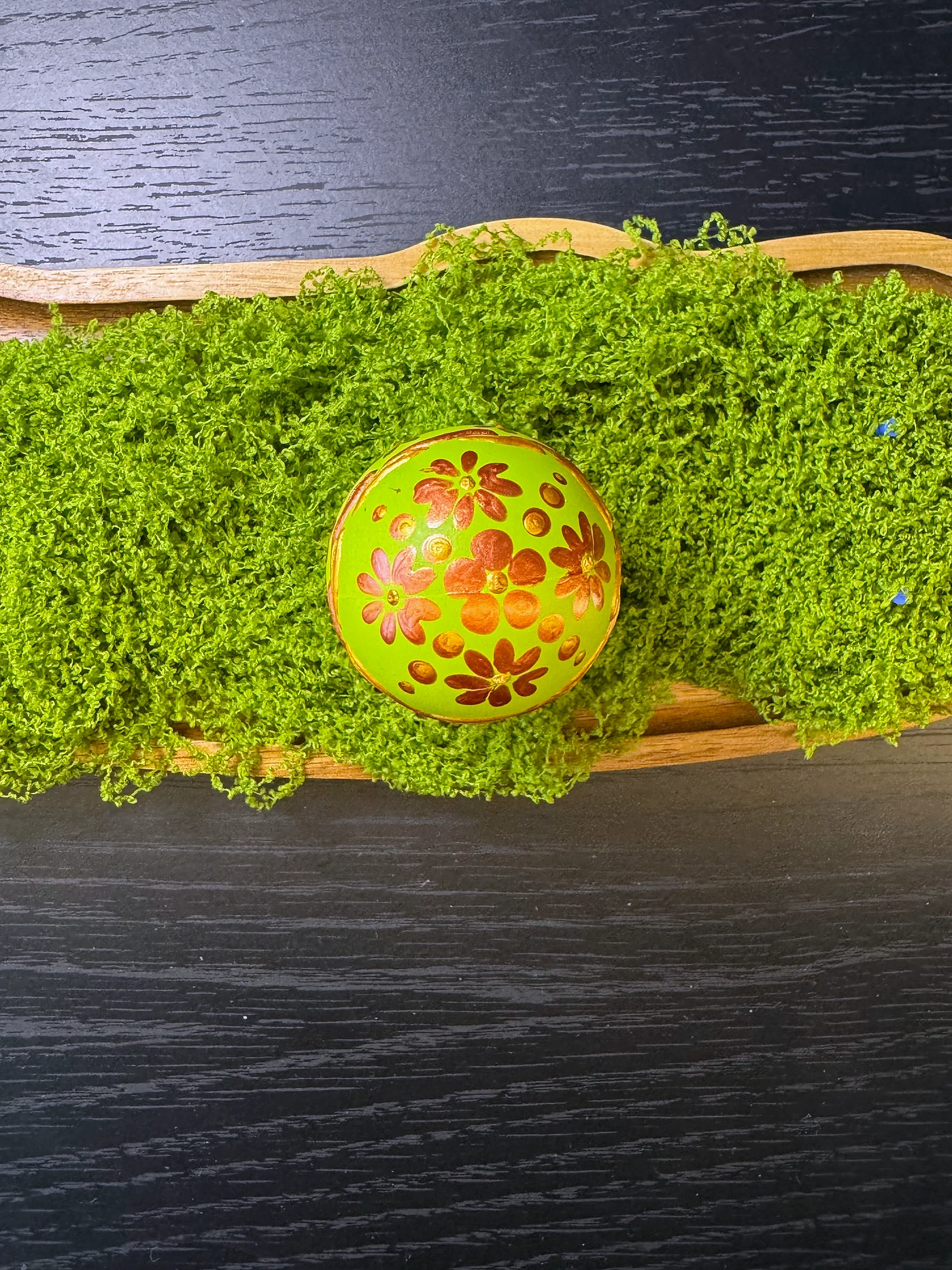 Jarko žutozeleno jaje ukrašeno raširenim smeđim i bakrenim cvjetnim lozama i grozdovima lišća. Ručno oslikani cvjetovi imaju zaobljene latice u zemljanoj terakoti.