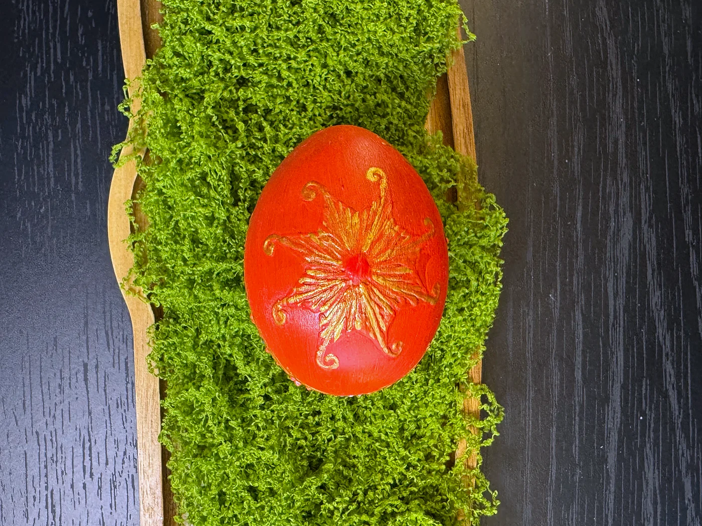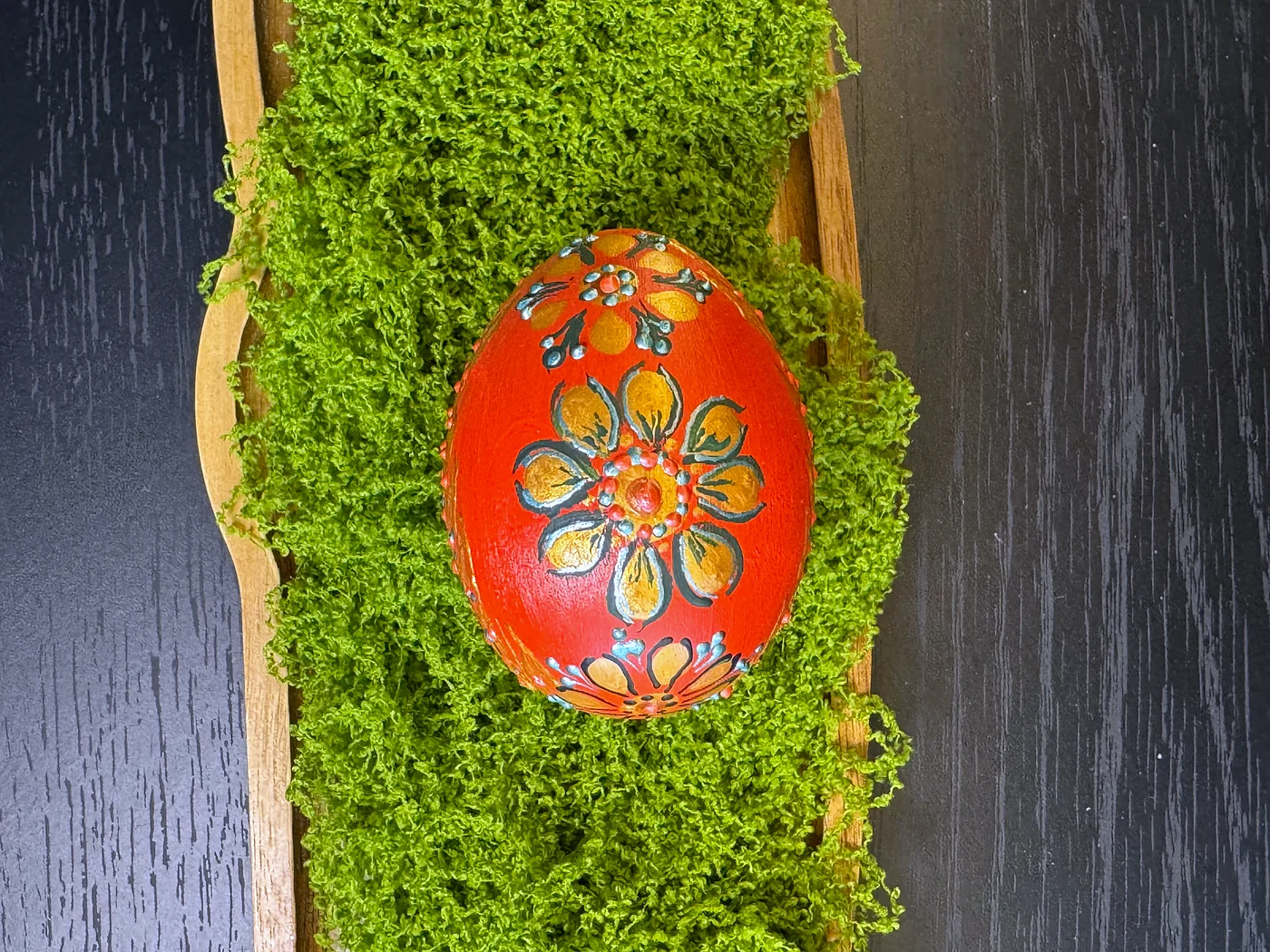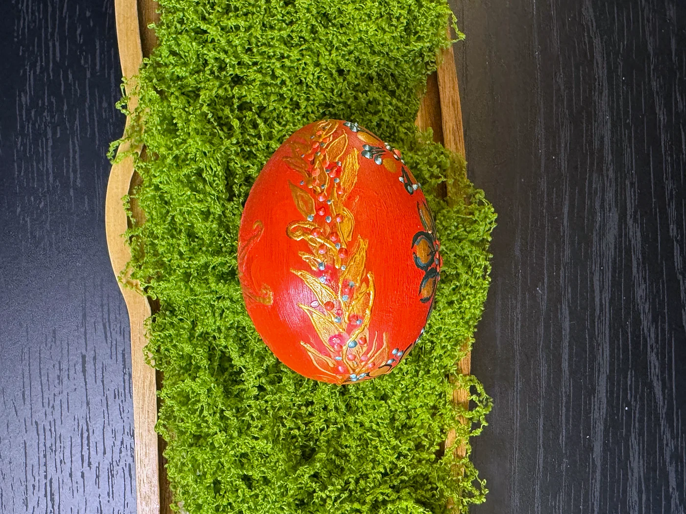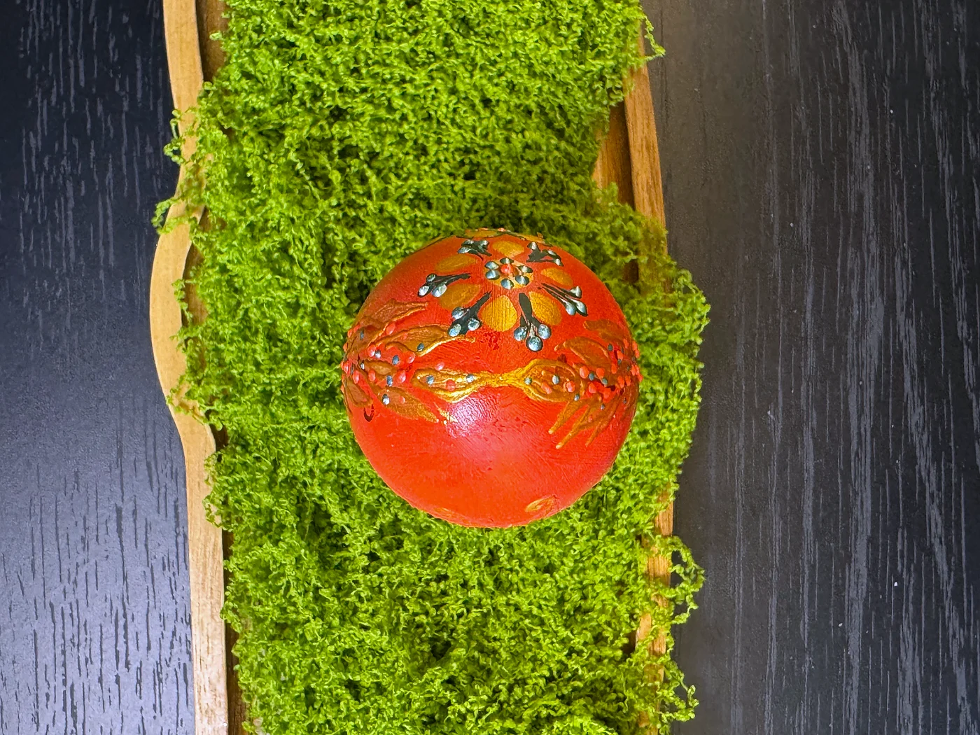 Bogato crveno-narančasto jaje u čijem središtu dominira velika cvjetna mandala u folklornom stilu. Tople žute, zelene i dodiri plave grade slojevite latice. Smjeli potezi kista evociraju istočnoeuropsku dekorativnu umjetnost.