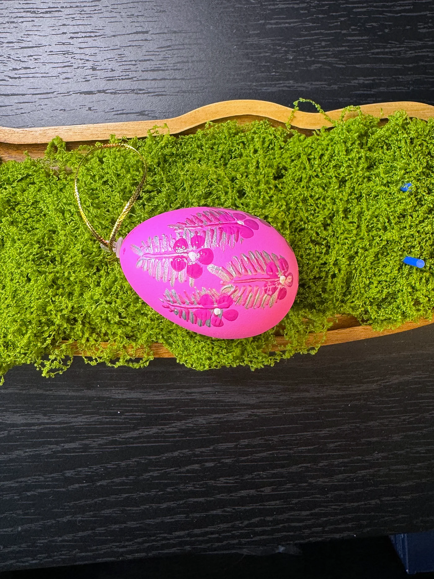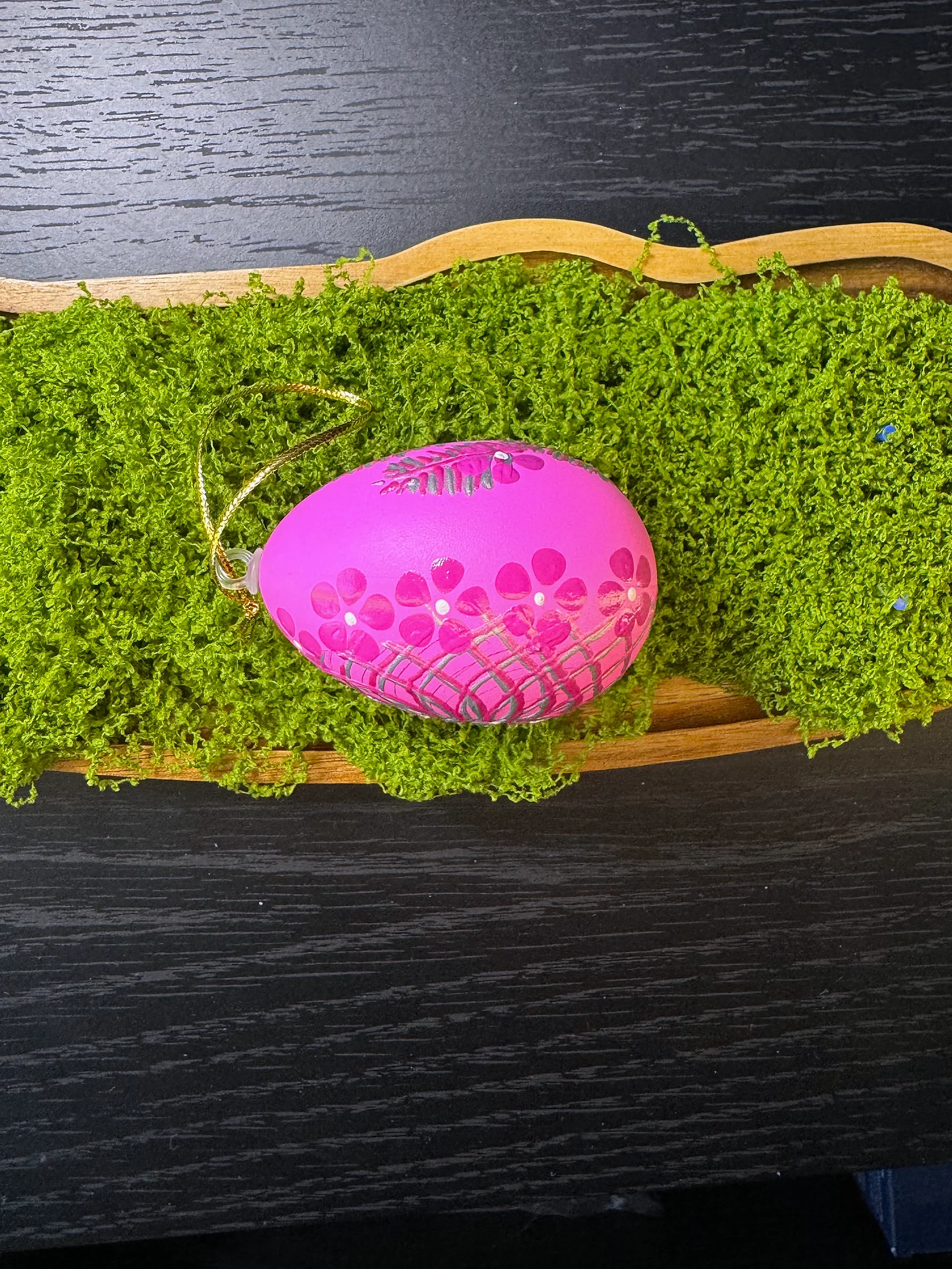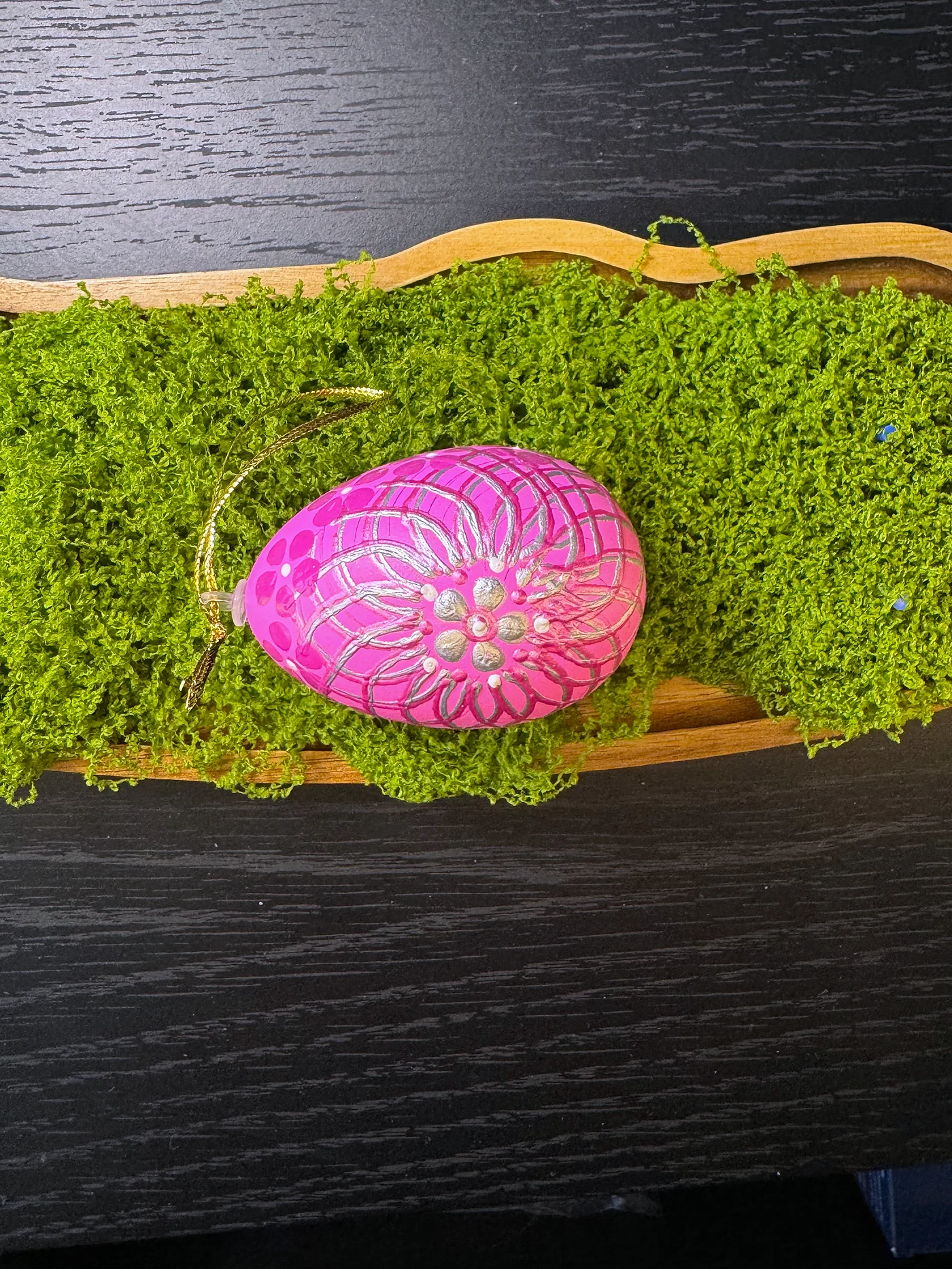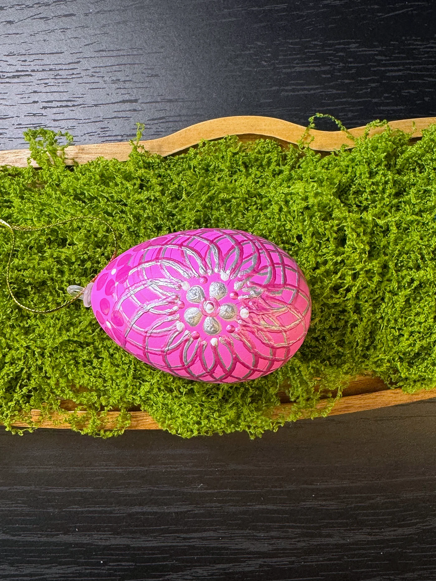 Živopisno magenta-ružičasto jaje sa zamršenom mrežom finih bijelih geometrijskih linija prekrivenom ručno oslikanim cvjetnim grozdom, stvarajući efekt vitražnog stakla.
