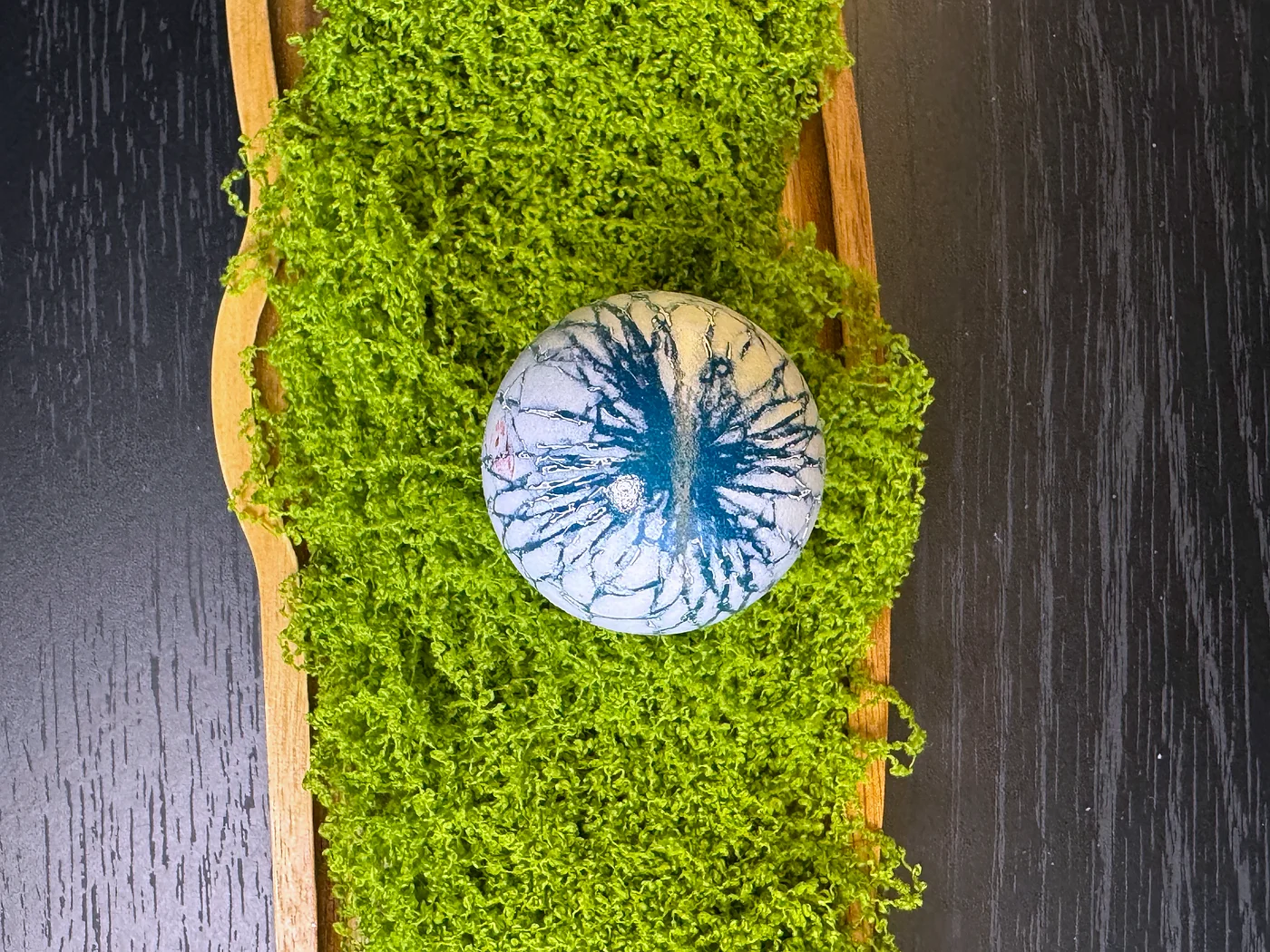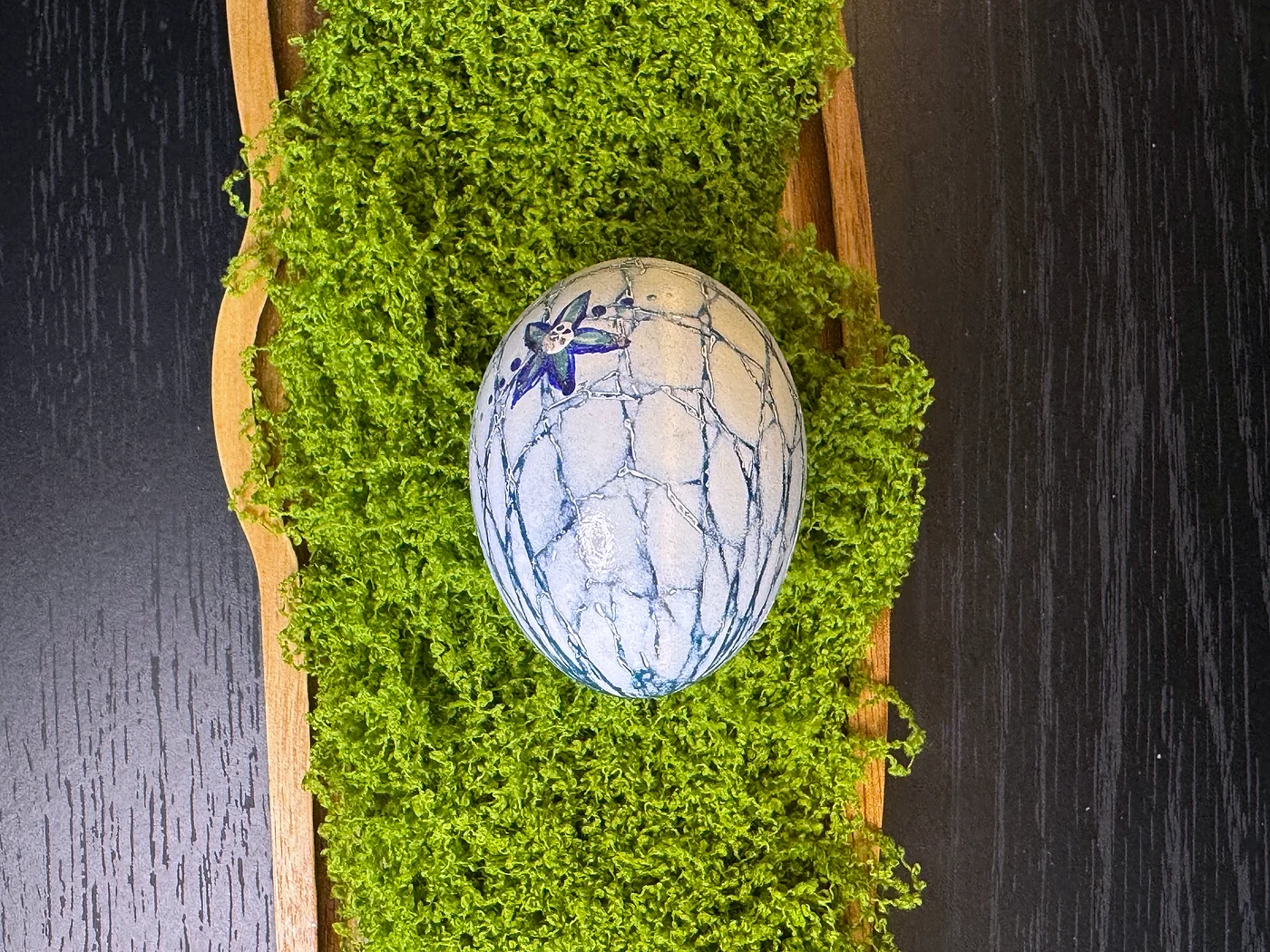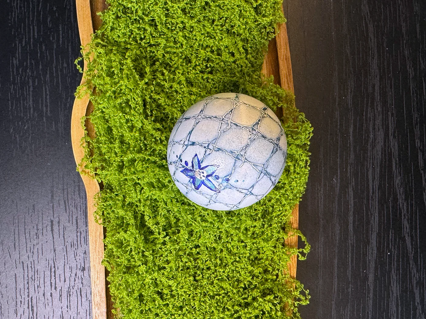 Bijela ljuska s organskom mrežom dubokih indigo-plavih žila koje se šire površinom poput napuknutog leda, s malim ručno oslikanim cvijetom kao nježnim akcentom. Efekt podsjeća na antičku keramiku s krakeliranom glazurom.