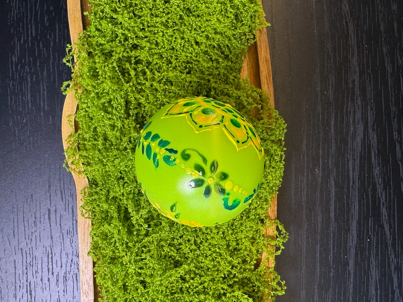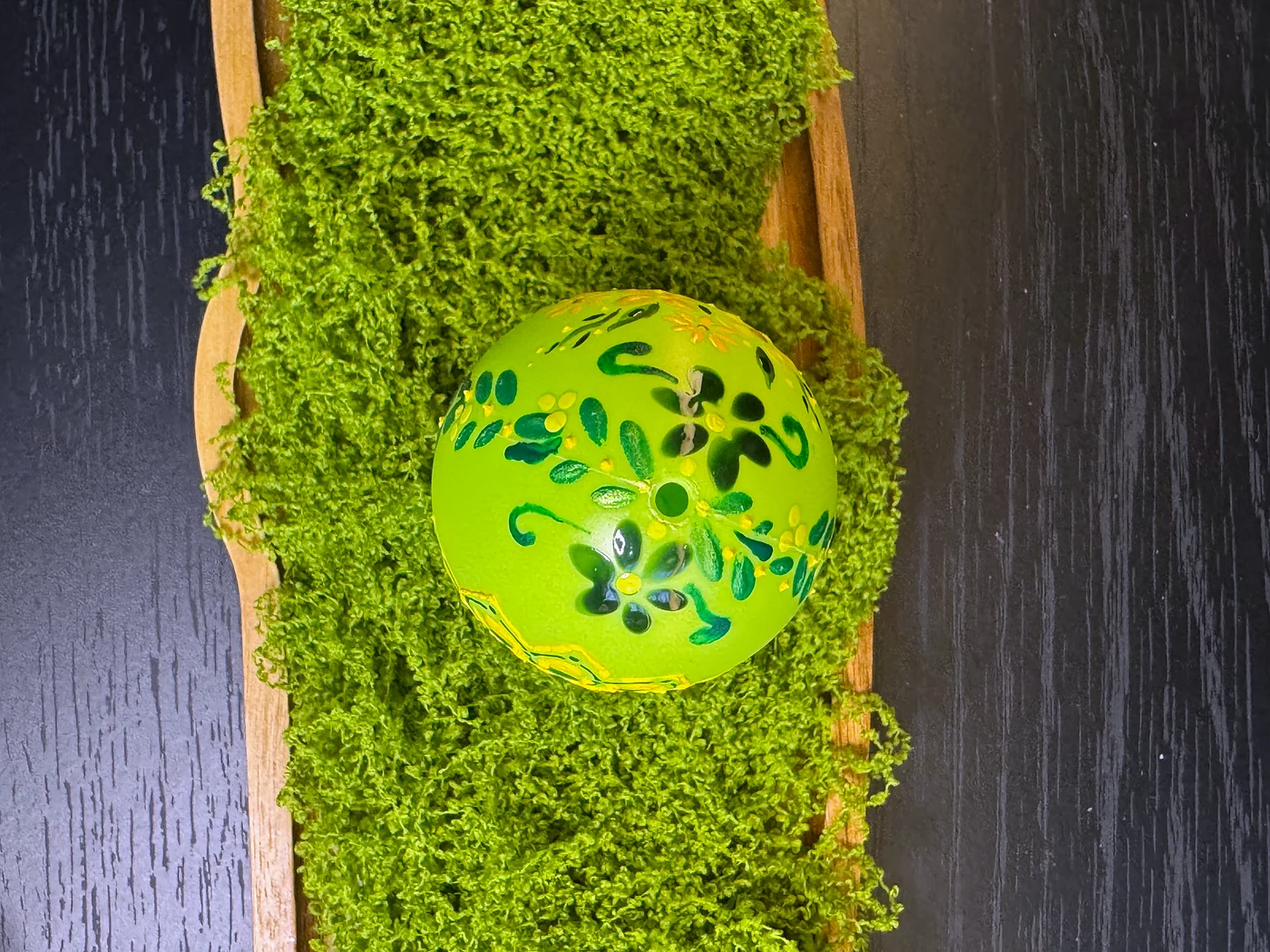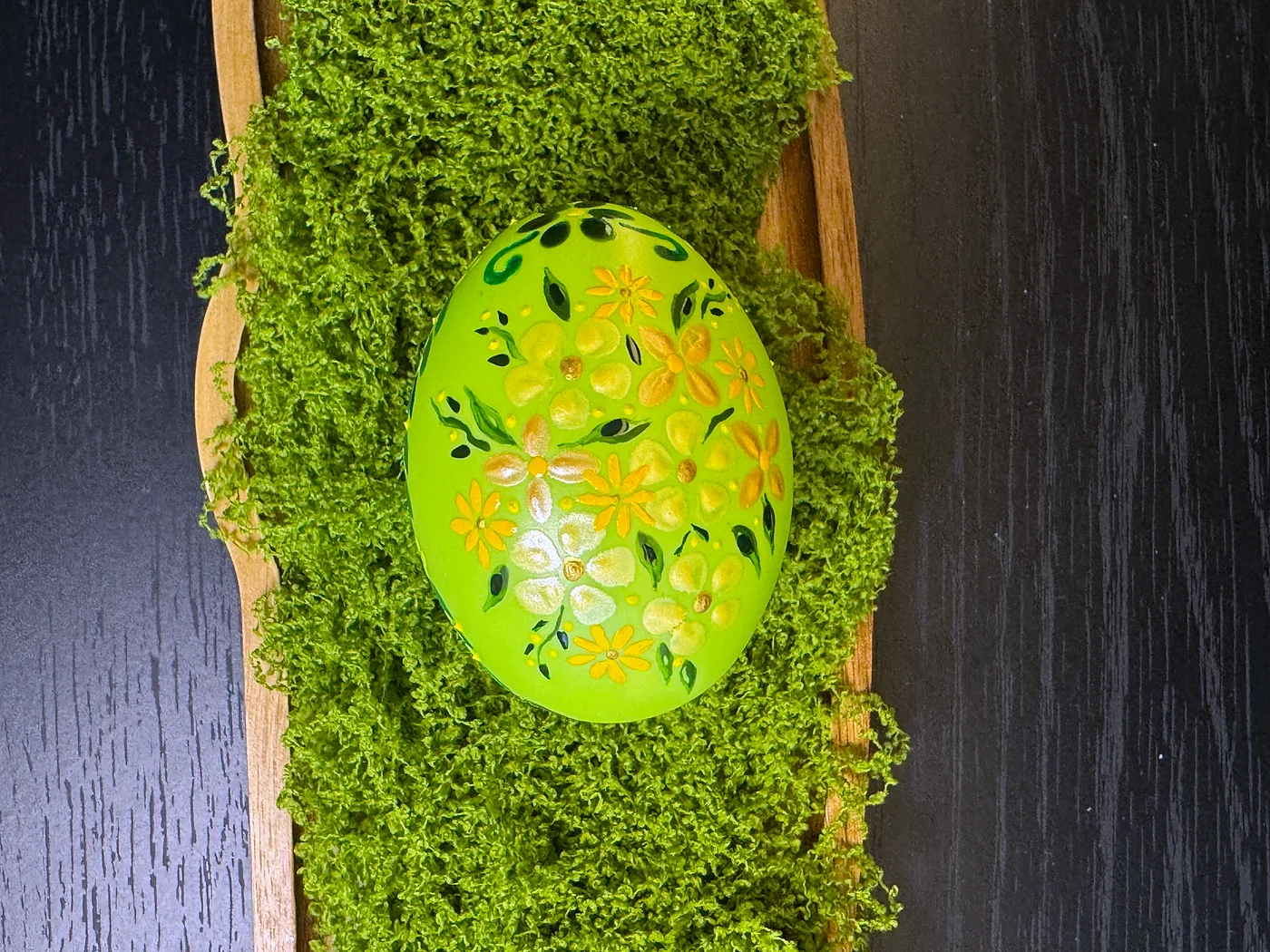 Jarko limeta-zeleno jaje prekriveno bujnim ručno oslikanim žutim i narančastim cvjetovima s tamnozelenim lišćem. Sitne bijele točkice akcentuiraju prostor između cvjetova.