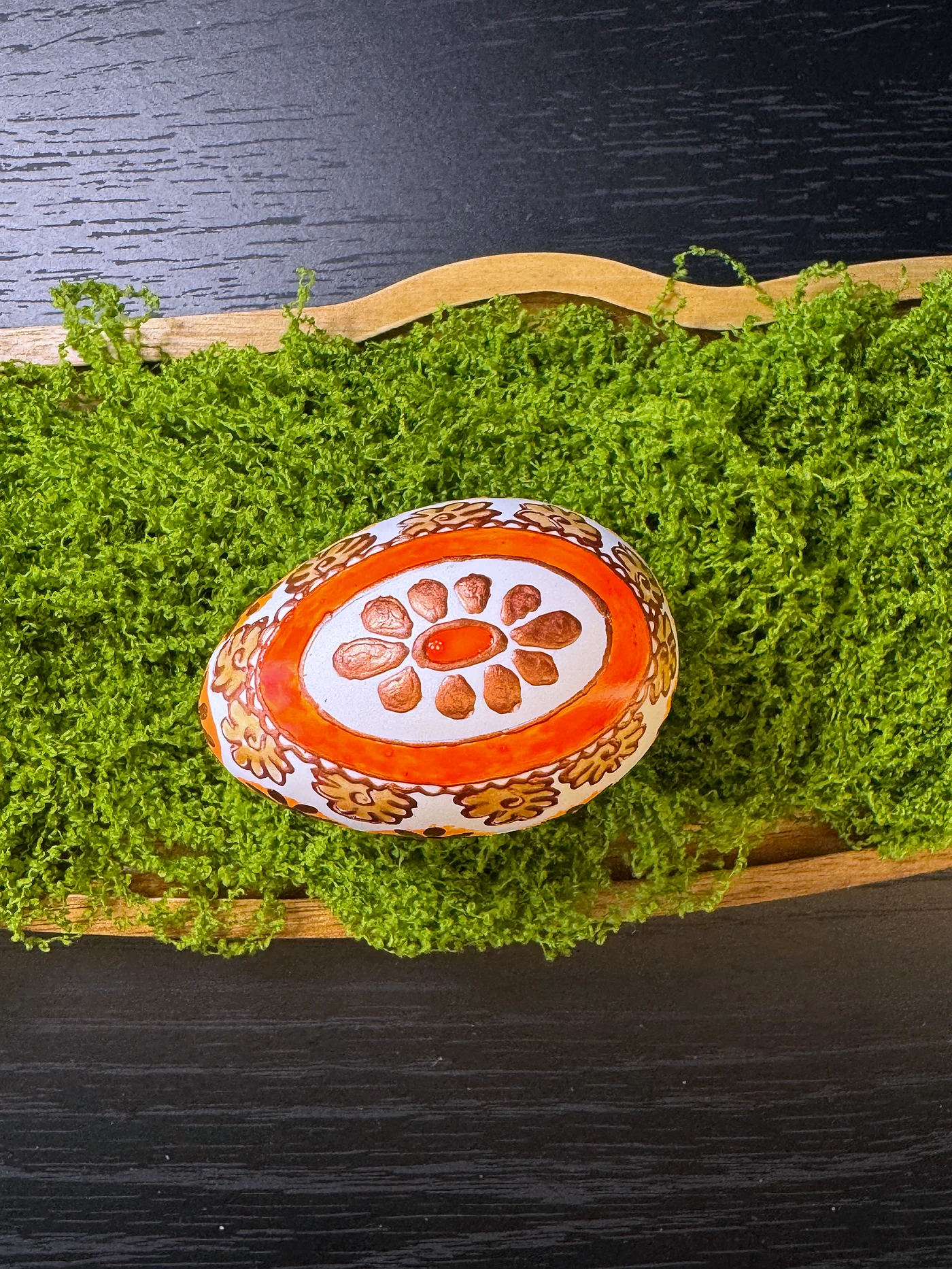 Toplo narančasto jaje s velikim medaljonom nalik mandali u sredini, izvedeno u tamnosmeđoj i krem boji. Koncentrični prstenovi kapljičastih latica i točkastih obruba šire se prema van.