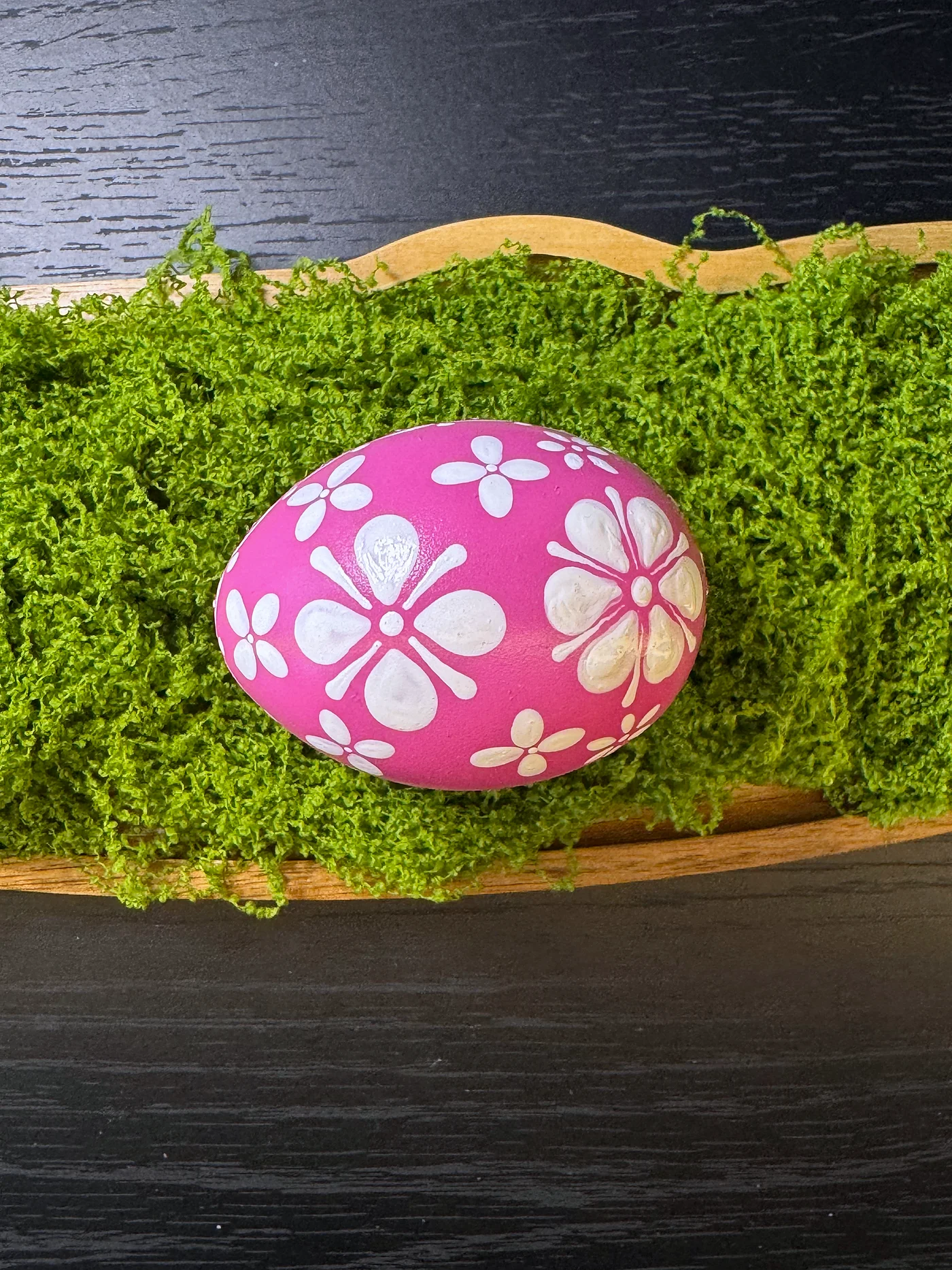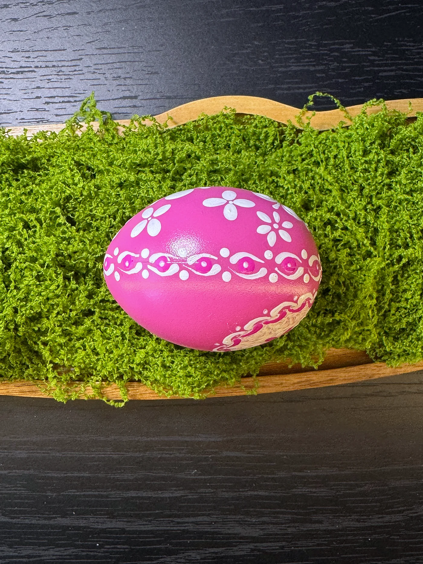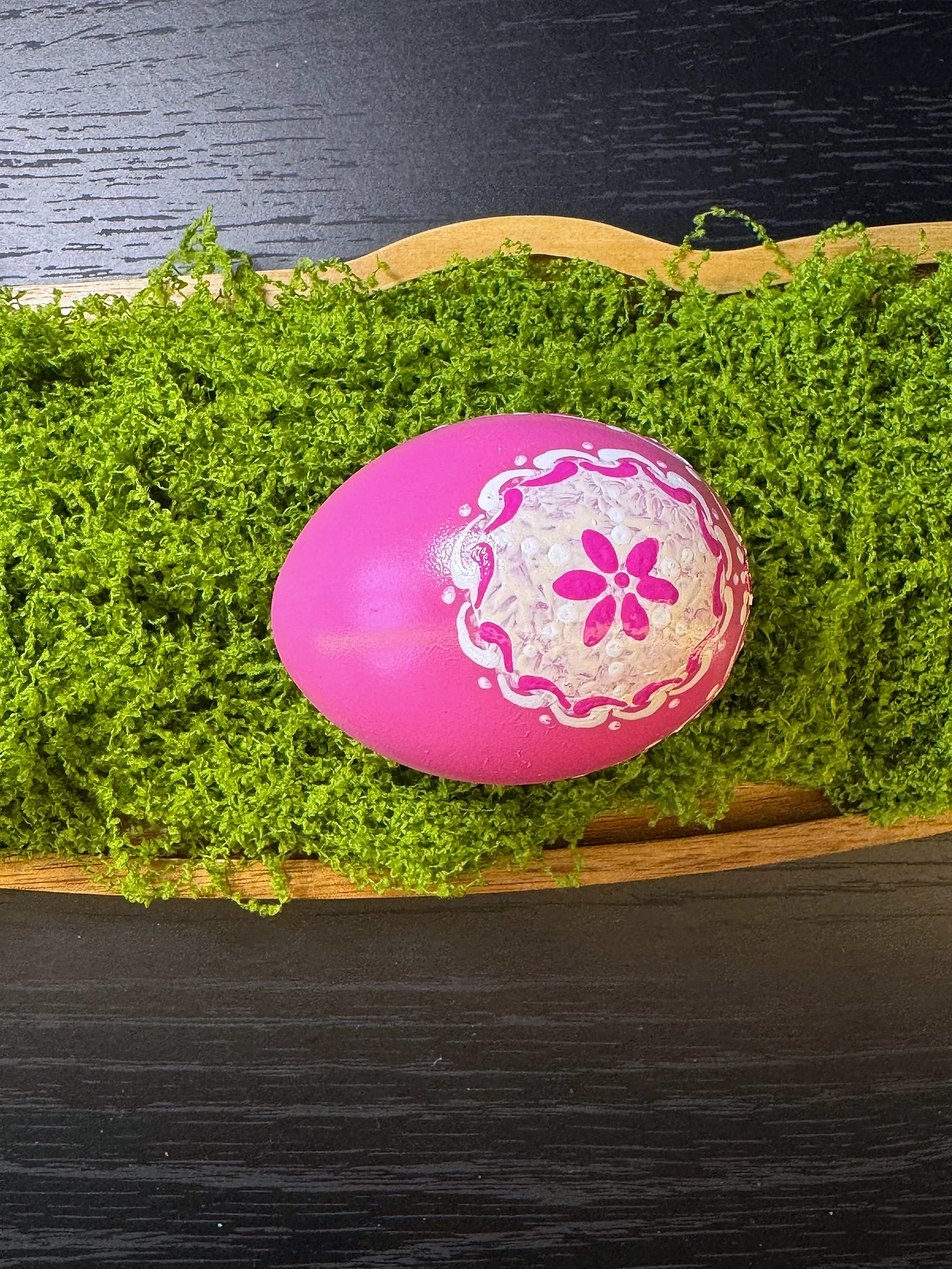 Glatko magenta-ružičasto jaje s jednim ovalnim medaljonom obrubljenim bijelim valovitim rubom, koji sadrži šesterolatični cvijet u dubokoj ružičastoj i bijeloj.