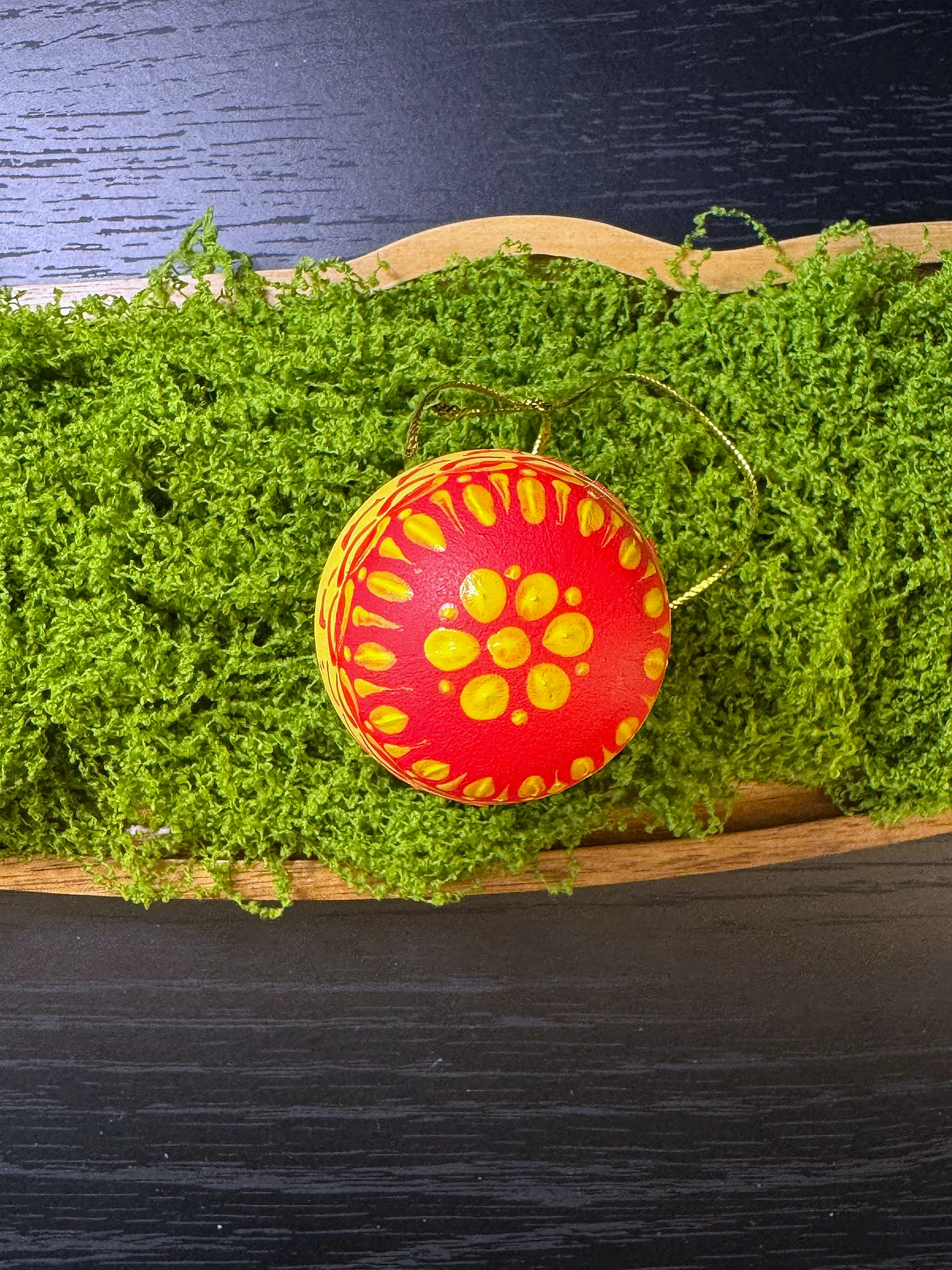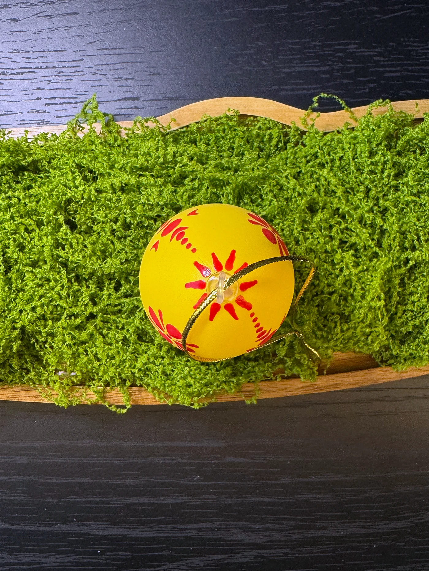 Jarko žuto jaje ukrašeno crvenim folklornim motivima. Valoviti luk zvjezdastih latica uokviruje jedan kraj. Crveno-na-žutoj paleta je smjela i sunčana.