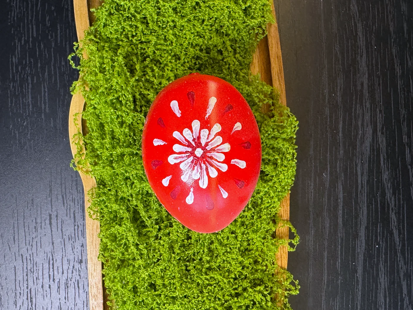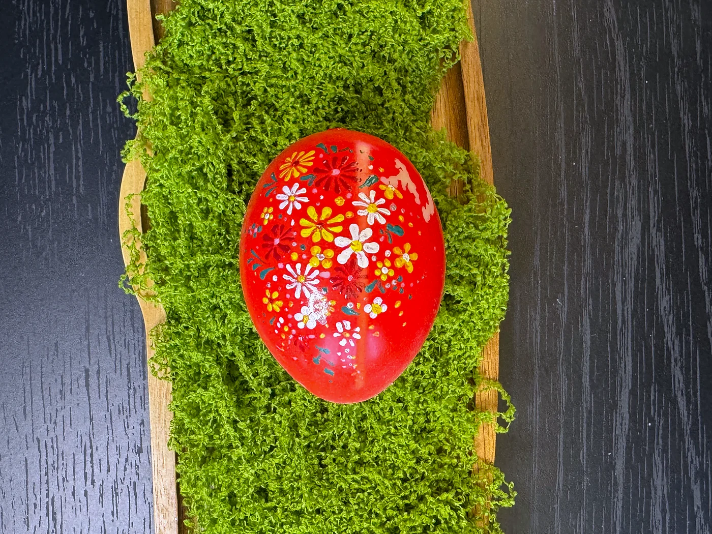 Ručno oslikani razbacani cvjetovi na sjajnoj crvenoj podlozi. Male tratinčice i zvjezdasti cvjetovi u bijeloj, žutoj i narančastoj slobodno su posuti po cijeloj površini.