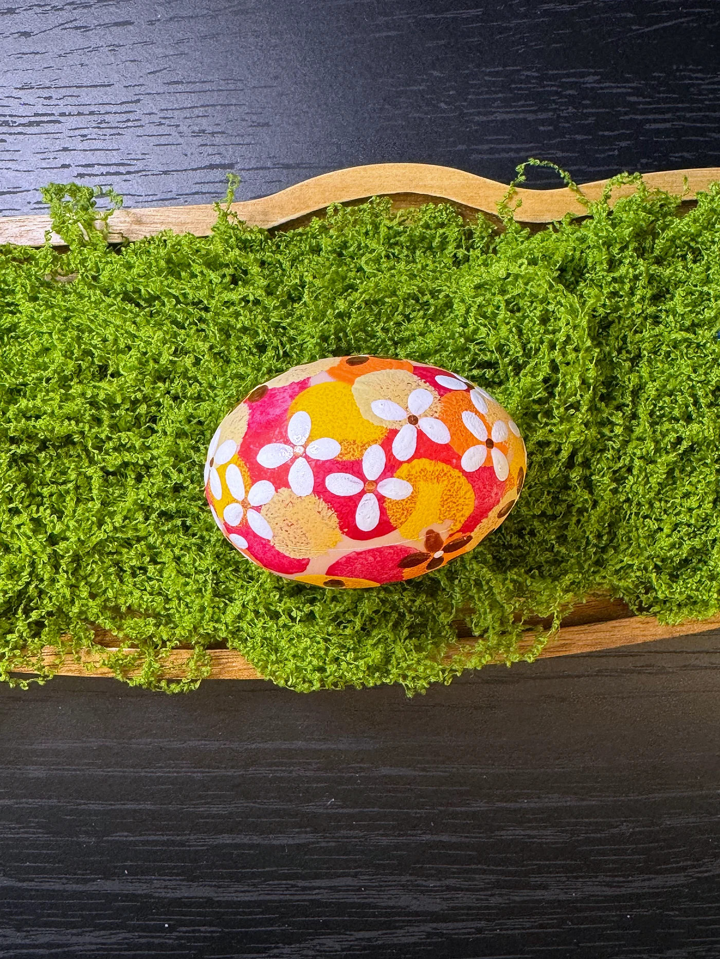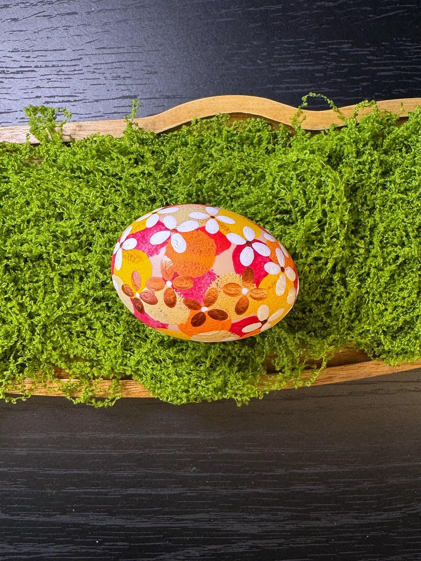 Živopisno jaje prepuno smjelih, preklapajućih cvjetnih oblika u žarko ružičastoj, sunčanožutoj, narančastoj mandarine i svježoj bijeloj. Bijele tratinčice razbacane su po toplim poljima boja.