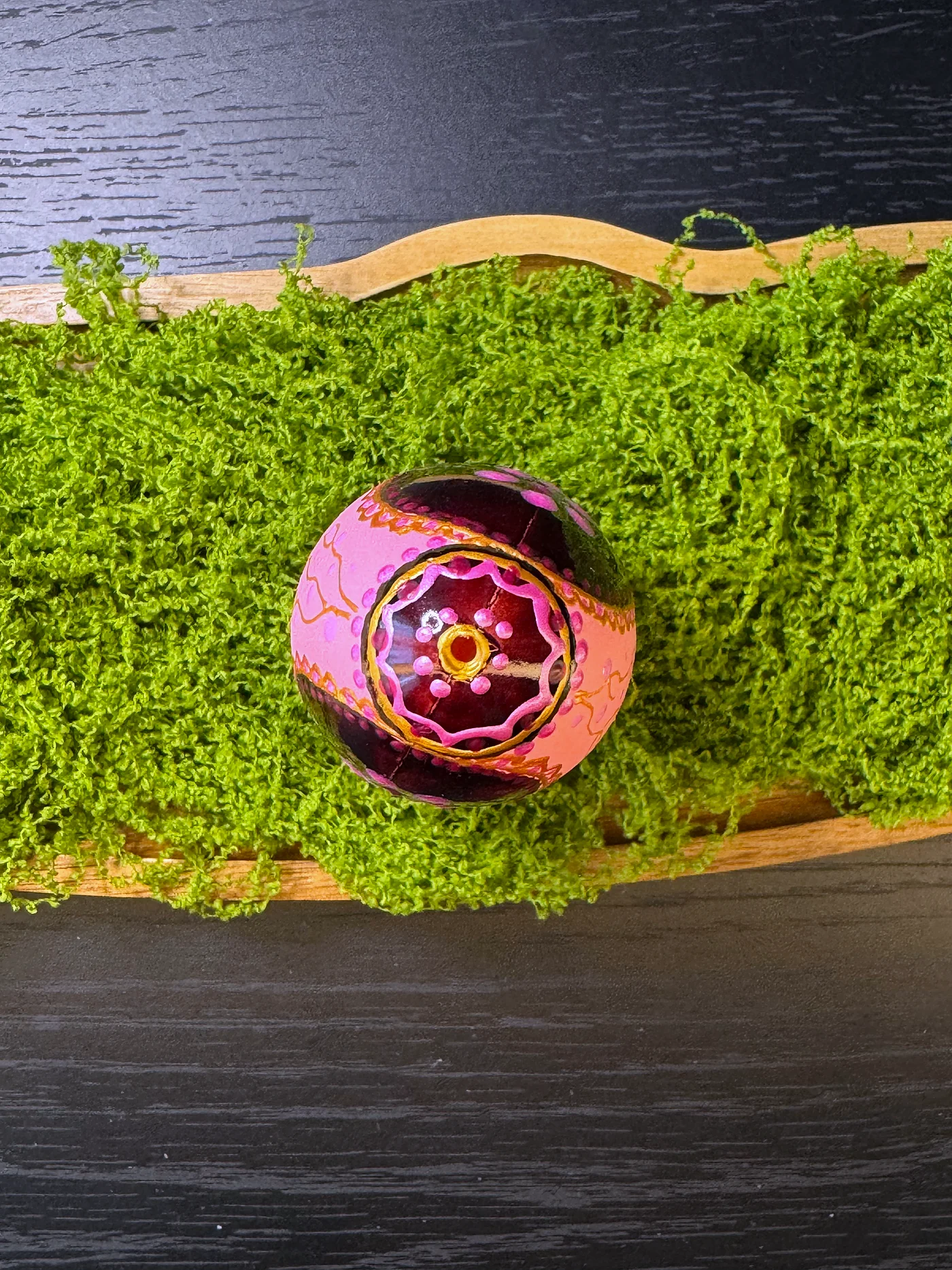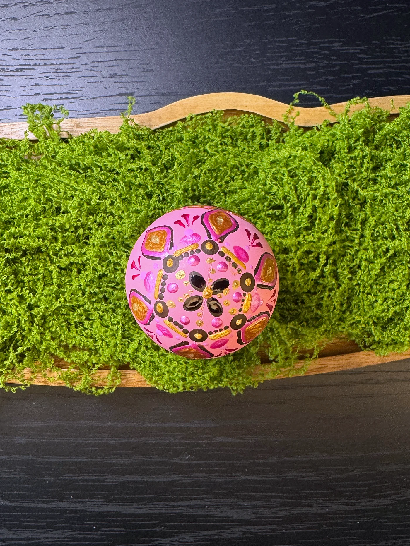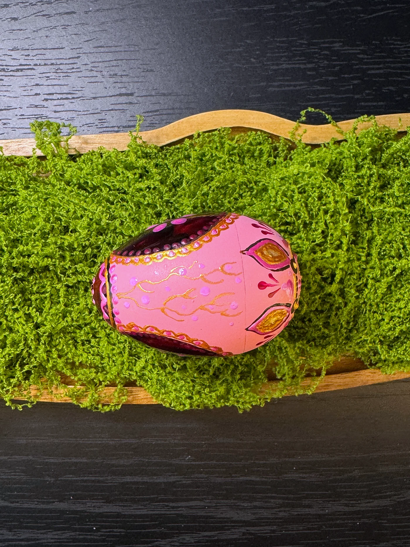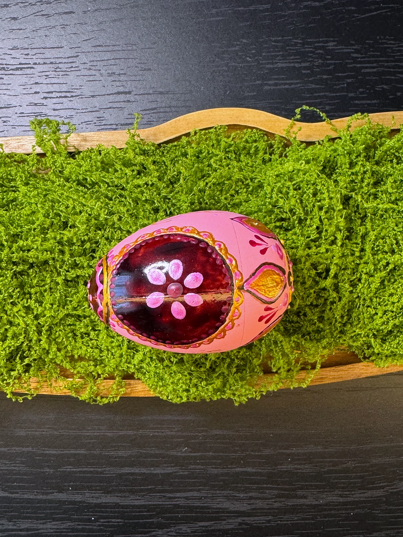 Toplo ružičasto jaje s ručno oslikanim cvjetnim središtem u dubljoj ružičastoj i bordo boji, uokvireno zlatno-žutim valovitim rubom i malim točkastim akcentima.