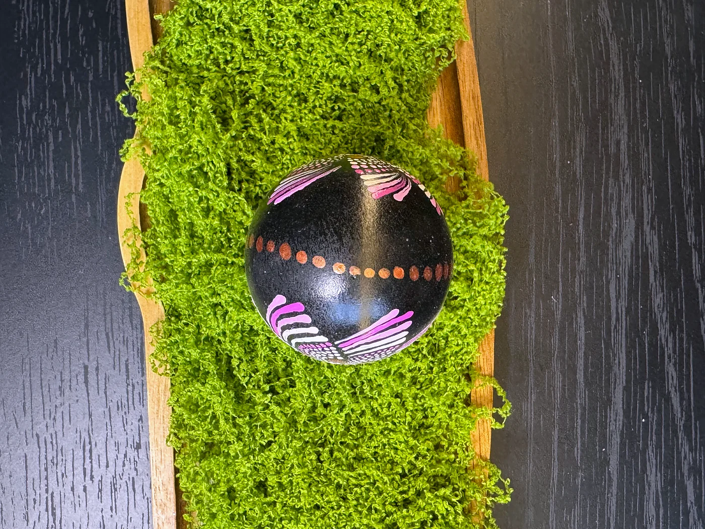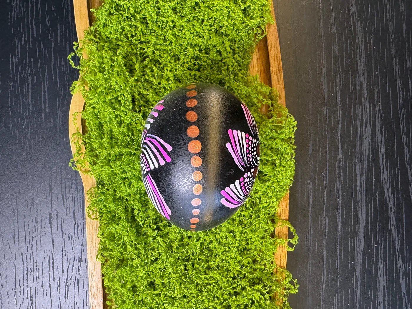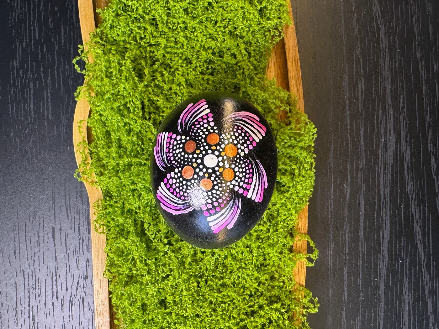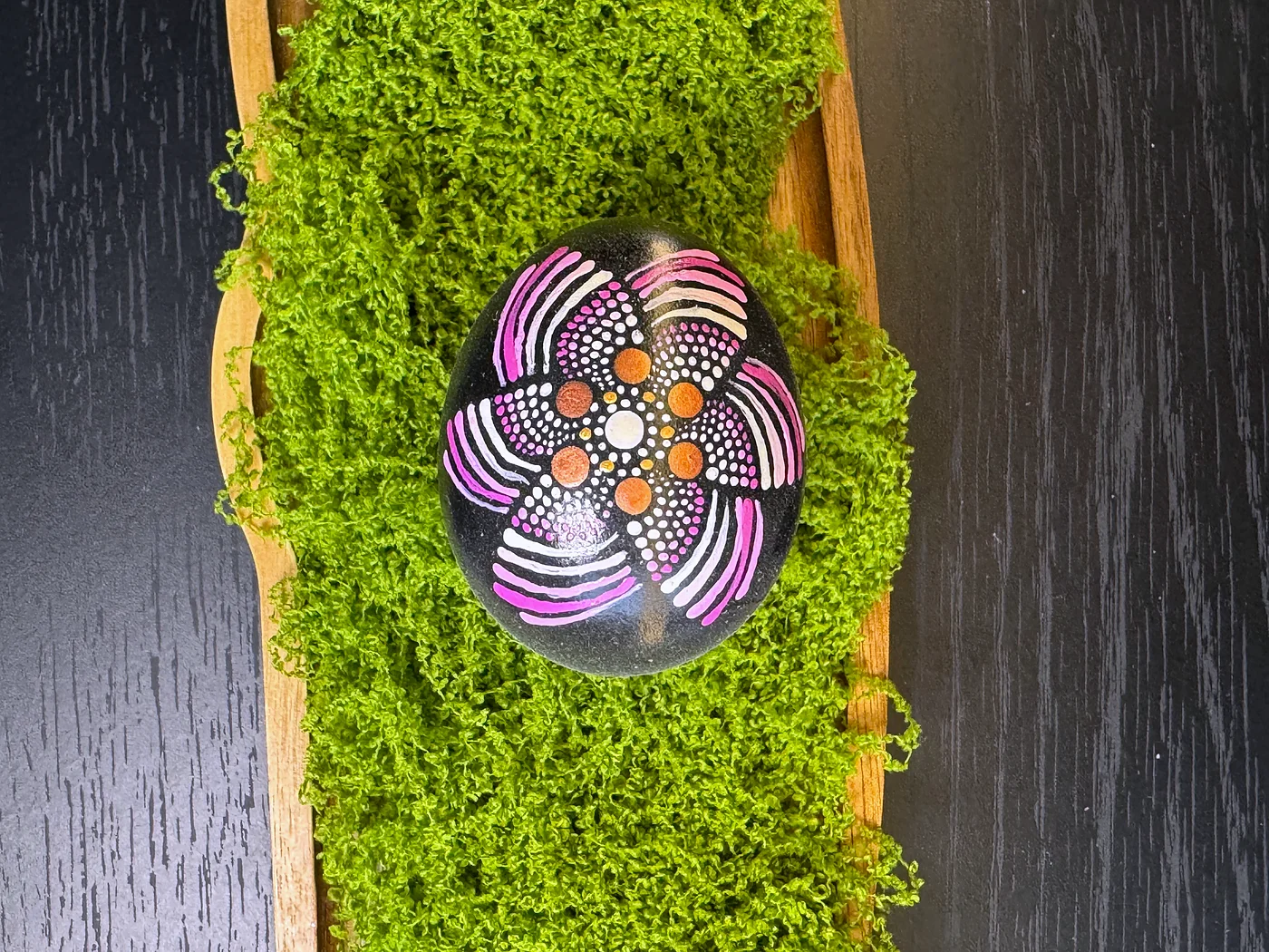 Tehnika točkanja mandale na tamnoj ugljeno-crnoj podlozi. Veliki središnji cvijet širi latice u izmjeničnim tonovima ljubičaste, bijele i narančaste, u potpunosti građen od pažljivo postavljenih ispupčenih točaka.