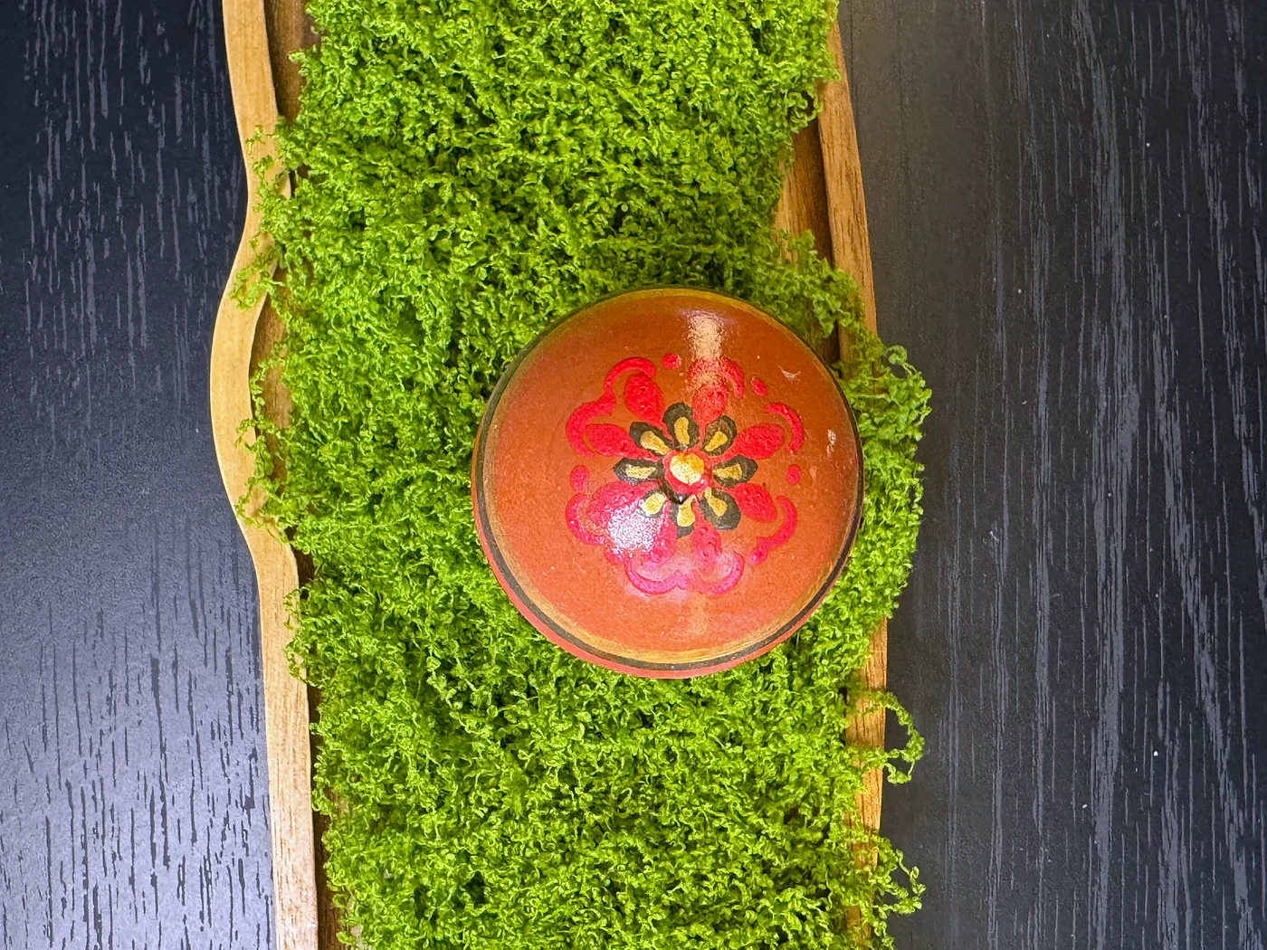 Ručno oslikan geometrijski dizajn na bogatoj bakreno-crvenoj podlozi. Vodoravne trake dijele jaje na registre, svaki ispunjen tamnim geometrijskim motivima u stilu križnog veza u crnoj i smeđoj boji. Paleta spaljene sijene, duboke crvene i crne evocira toplinu žeravice.
