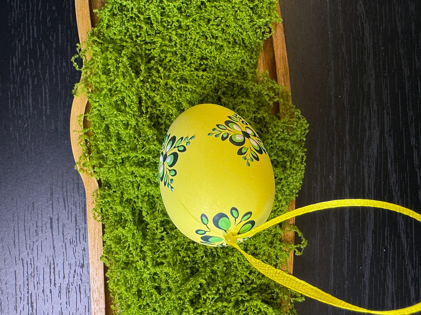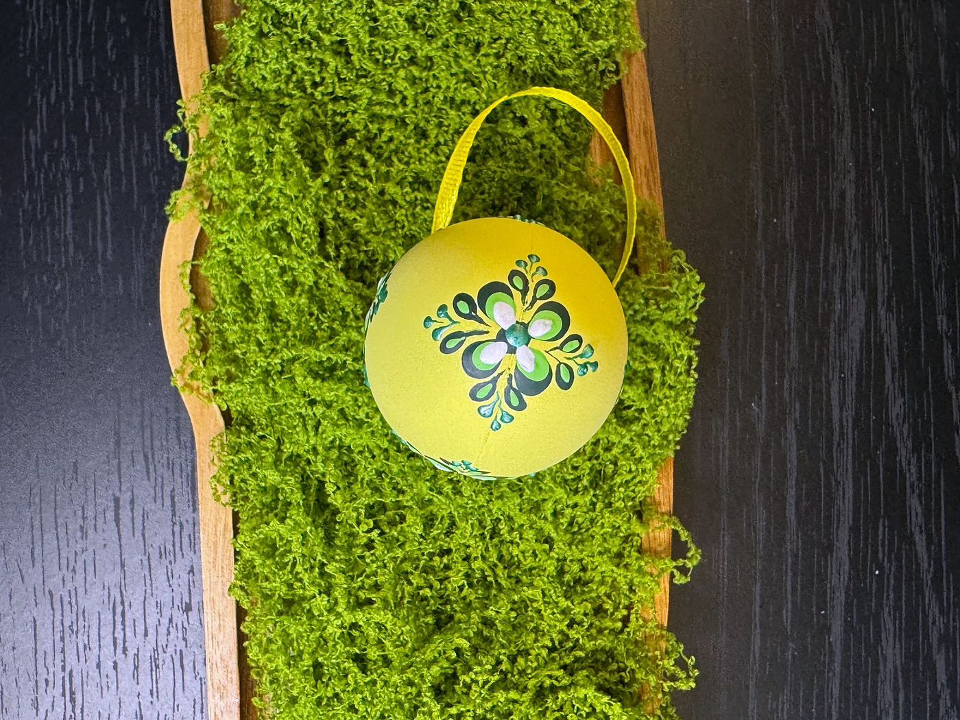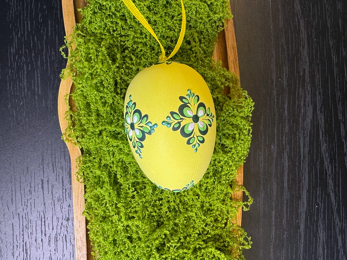 Ručno oslikan cvjetni dizajn na blijedoj maslačno-žutoj ljusci. Tamni tirkizno-zeleni grozdovi cvjetova s vijugavim stabljikama krase jednu stranu u gracioznom, spuštajućem aranžmanu loze.