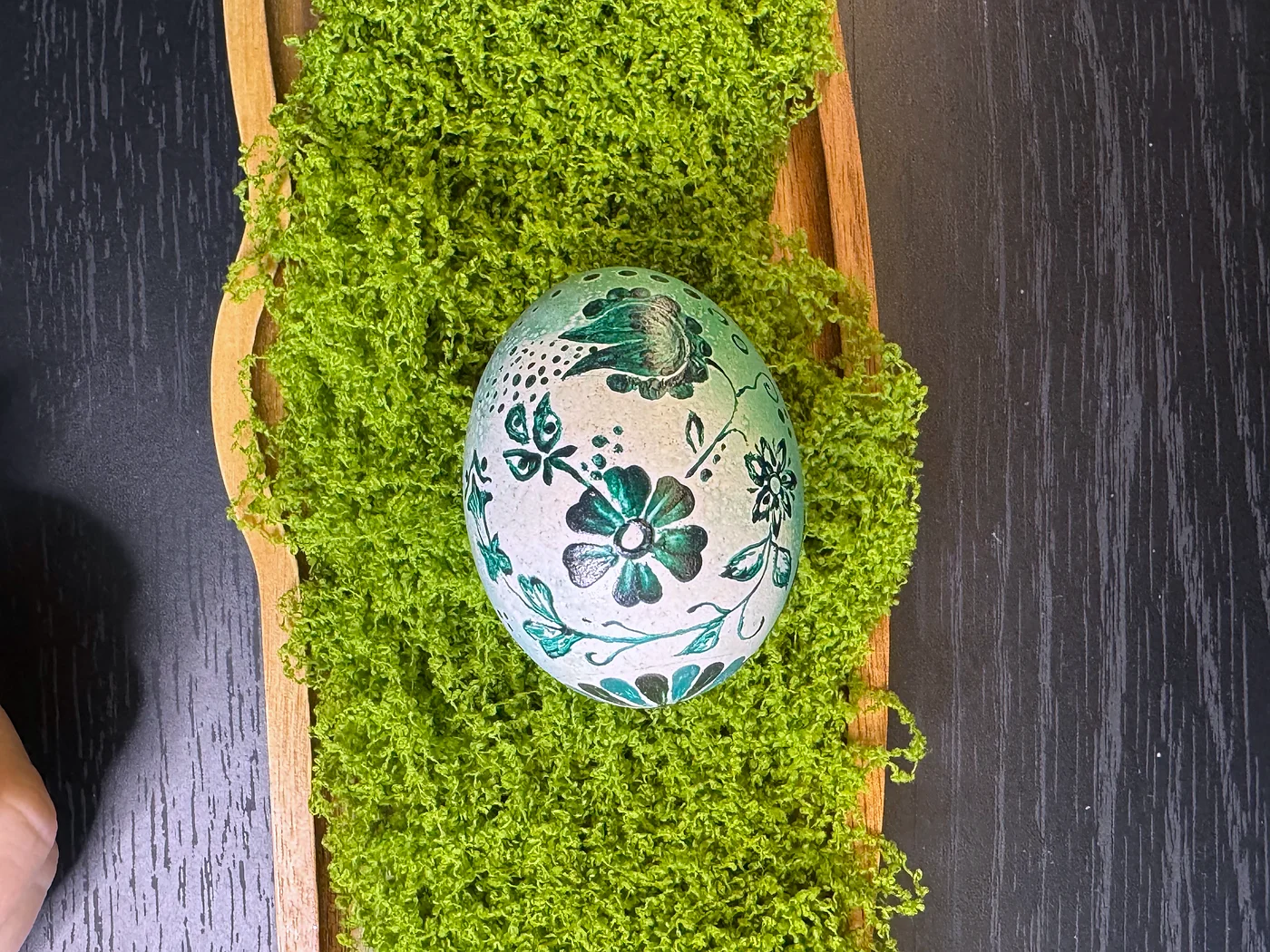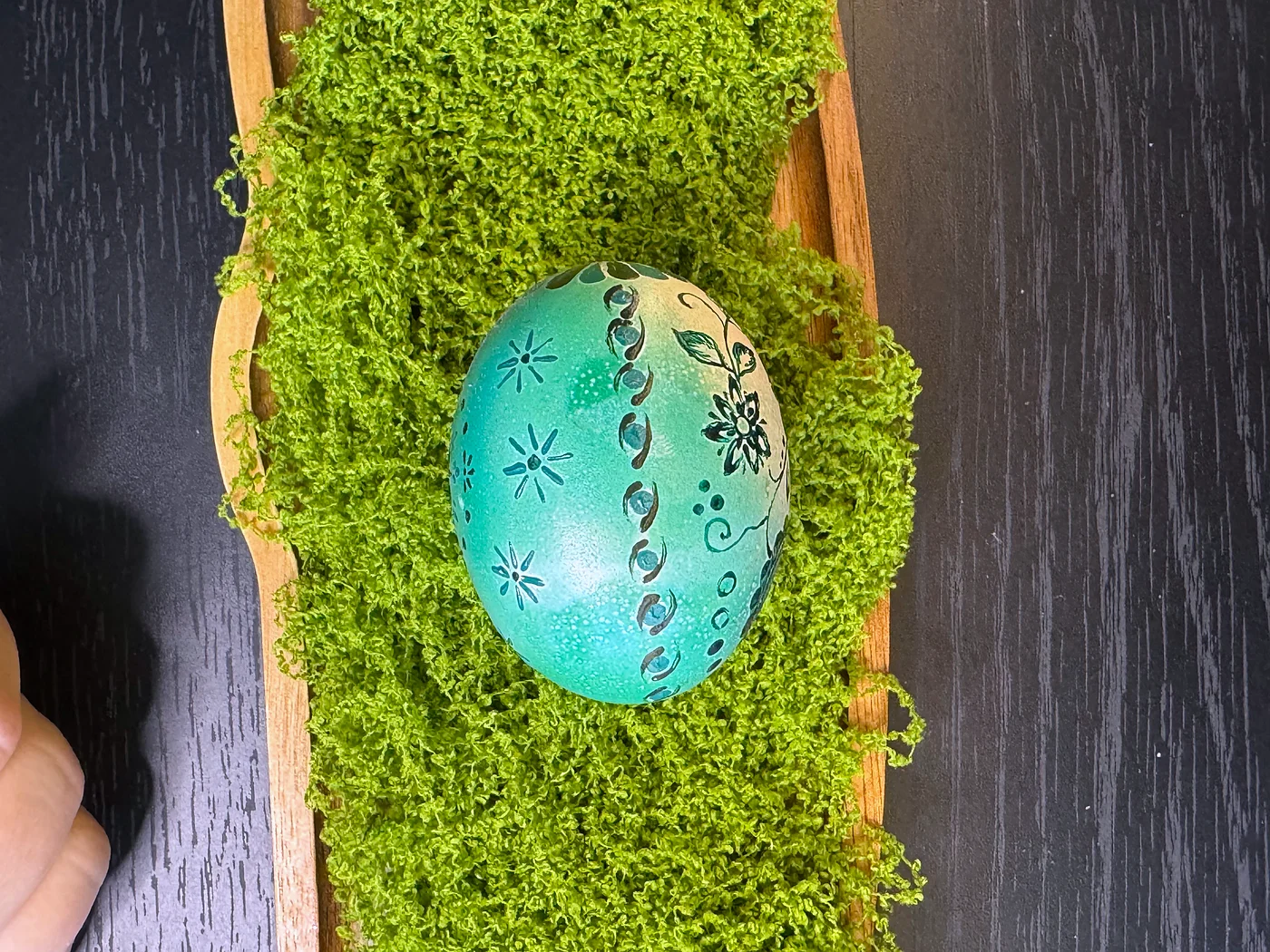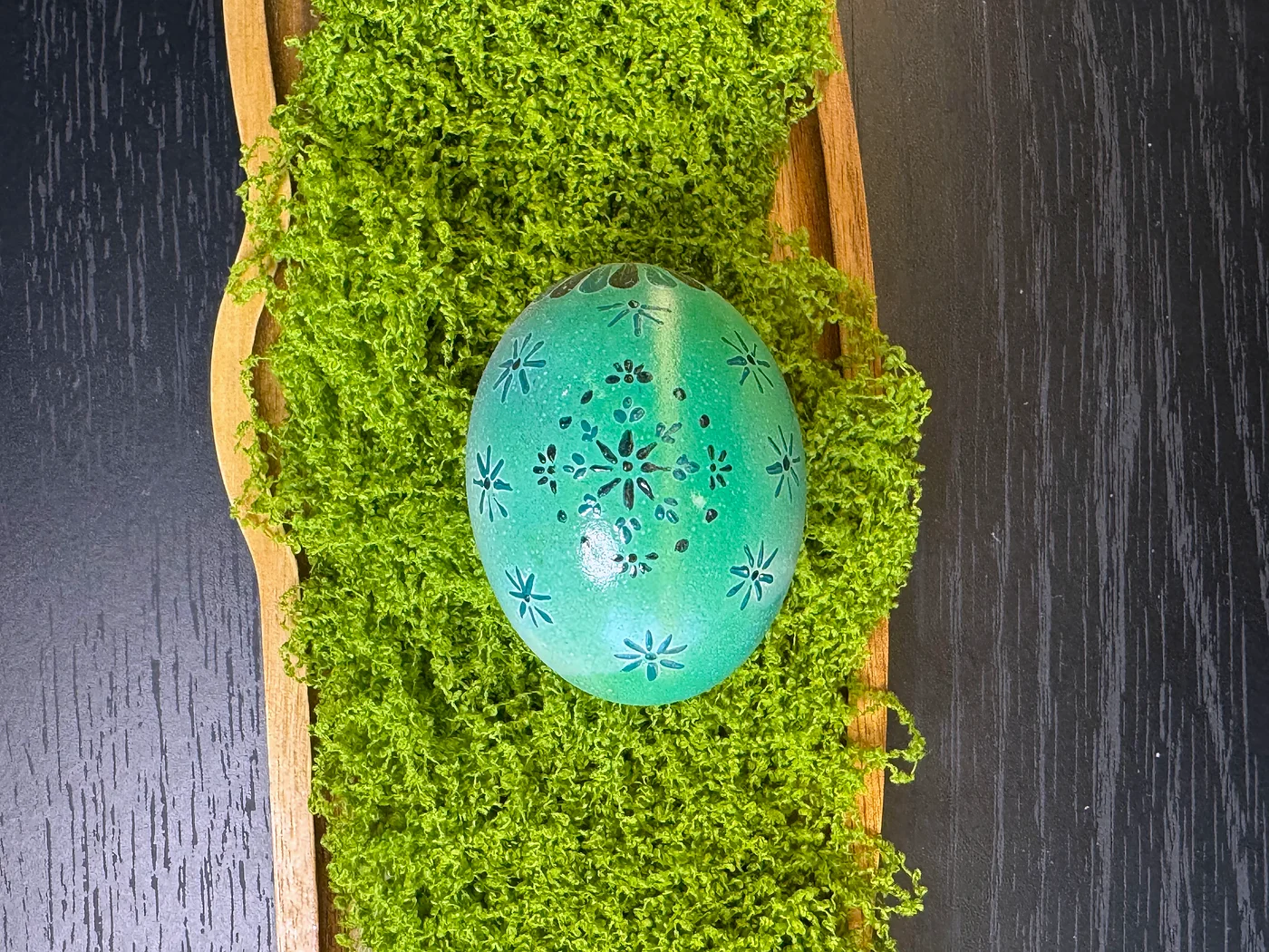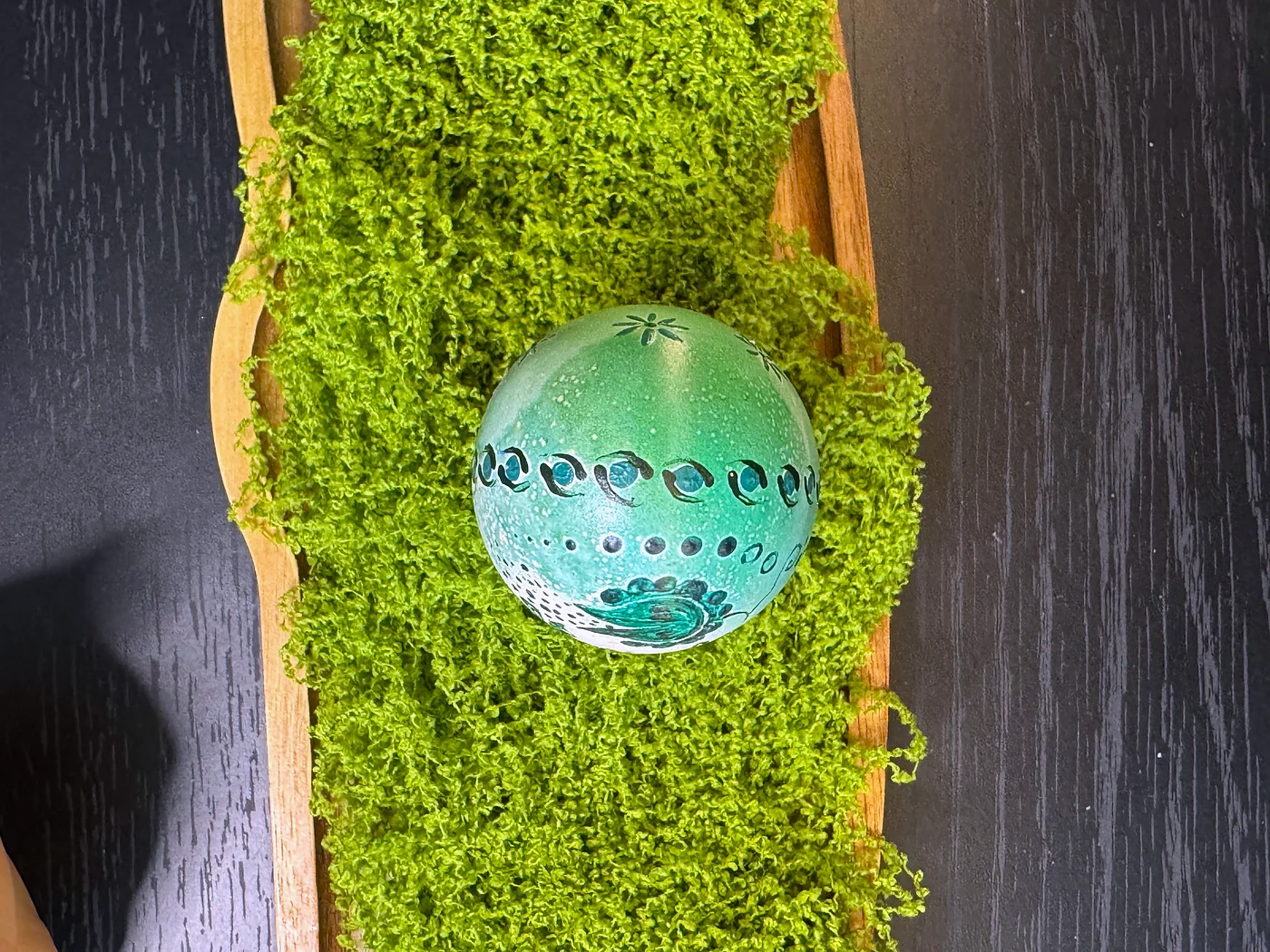 Ručno oslikan dizajn na nježno morsko-zelenoj obojenoj ljusci. Razbacani motivi zvjezdastih i pahuljastih oblika u tamnom tirkiznom i crnom šire se po površini. Hladna paleta od mente do žada stvara smirenu, zimsku eleganciju.